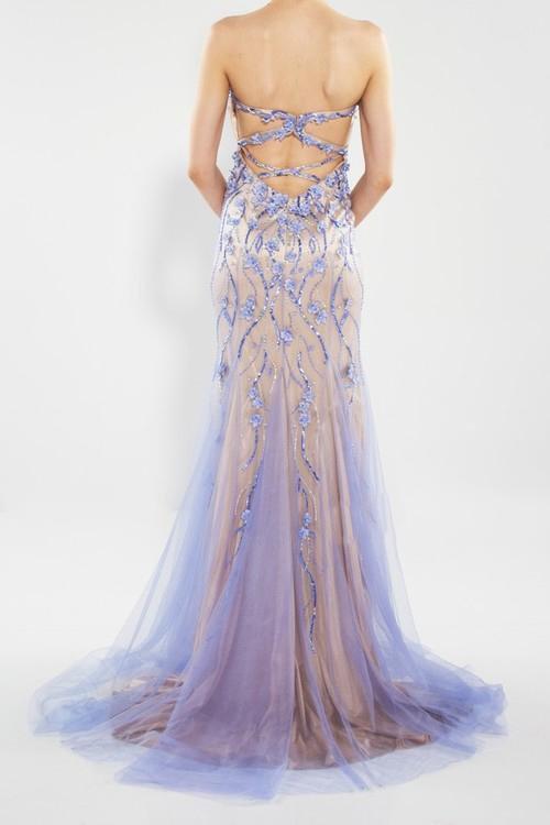 Grab everyone's attention in this curve-hugging strapless long gown! A demure nude lining sets the backdrop for the gorgeous sparkling beaded net and flower applique encompassing the gown from the sweetheart neckline, around the criss-cross strap open back detail, as well as cascading down to the flared sheer layered godets on the skirt and train.