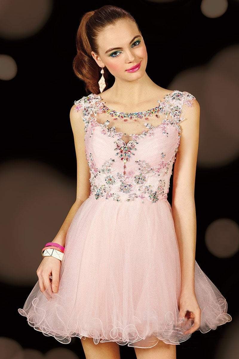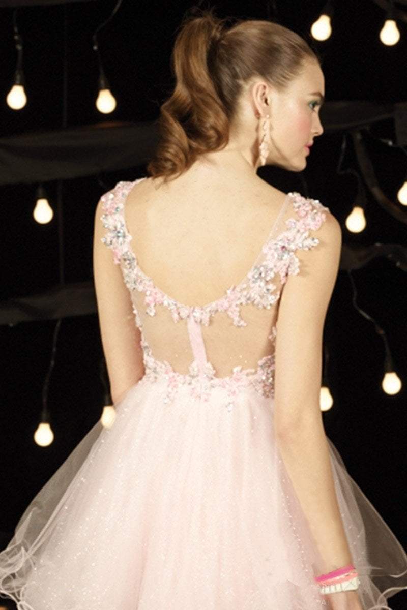 Look phenomenal at your prom, homecoming, or sweet sixteen celebration in this stunning short lace dress with sleeveless illusion neckline and back. Demure lace combined with a subtle touch of sparkling beadwork and a short layered skirt.