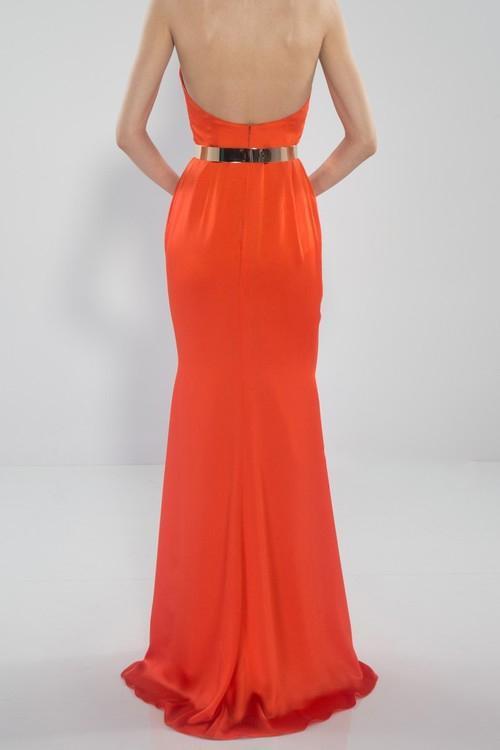 Curve-hugging charmeuse long gown with train features a strapless sweetheart neckline pleated bodice lending to a draped-like illusion layered flare skirt showcasing a fantastic accenting gold metal belt around the waist. Simply elegant!