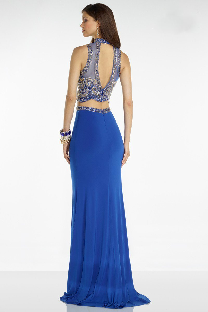 All attention will be on you when you walk out in this dazzling two piece dress with a full, uniquely beaded open back top, and a simple skirt with gems along the waistline.