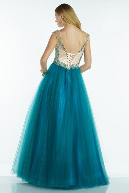 Sparkle in this stunning ball dress with a sheer illusion neckline, sequin bodice, and open corset back.
