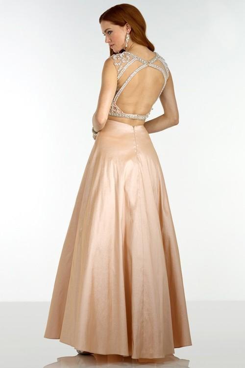 Be magical in this two piece dress with a detailed and beaded open back top and a simple solid skirt.