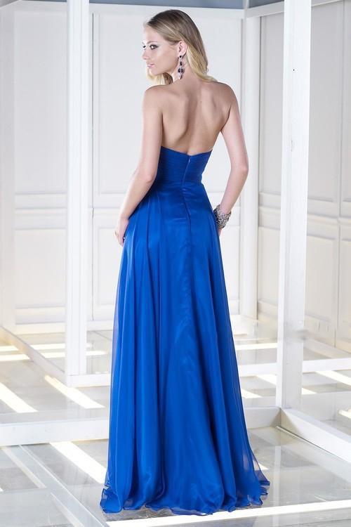 Simple and sophisticated, this stunning chiffon gown has a ruched bodice with beaded waist detail, sweetheart neckline, and soft flowing chiffon layers. This dress is perfect for prom, homecoming, or military ball!