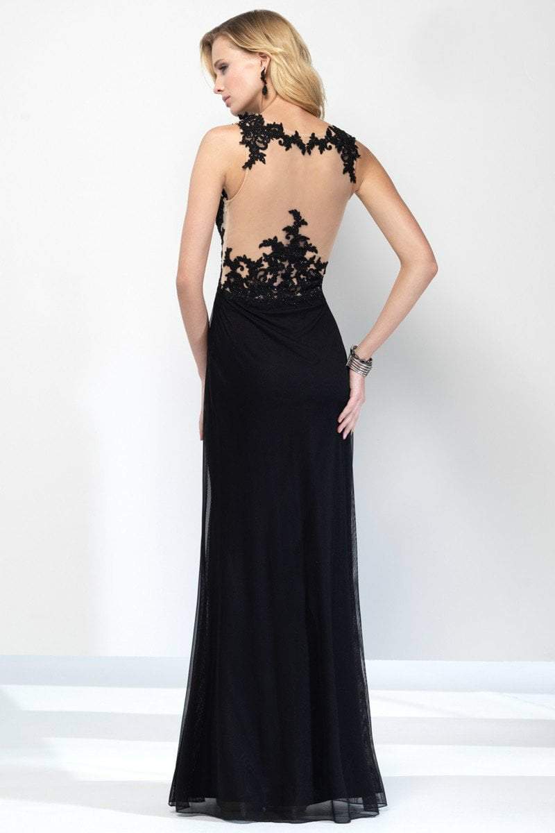 Mesh flowy dress with a rouched bodice and lace illusion neck, along with a full illusion lace back
