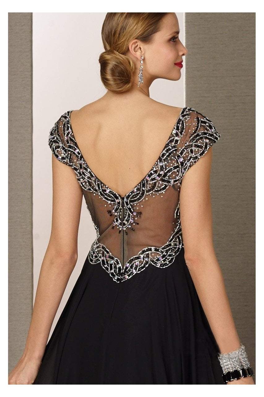 Feel gorgeous and stunning all night in this cap sleeve floor length gown, which features beautiful beading on an off the shoulder Queen Anne neckline bodice that flatters the body. The V-cut back has an illusion beaded design to show just enough skin!