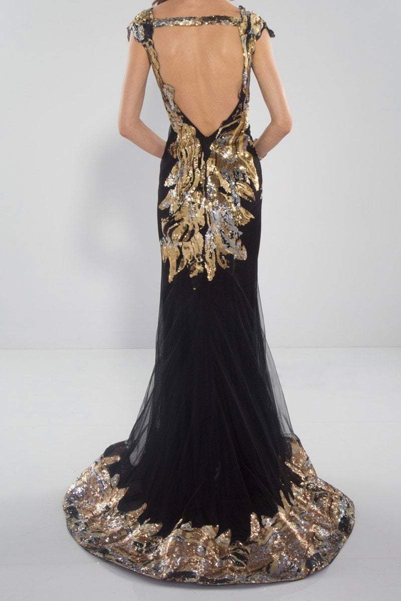 Feel red carpet ready in this slim mermaid gown with sweep train that showcases a stunning beaded sequin print pattern across the sheer illusion neckline, cap sleeves, and bodice, around to the alluring open back strap detail, and down through the hemline