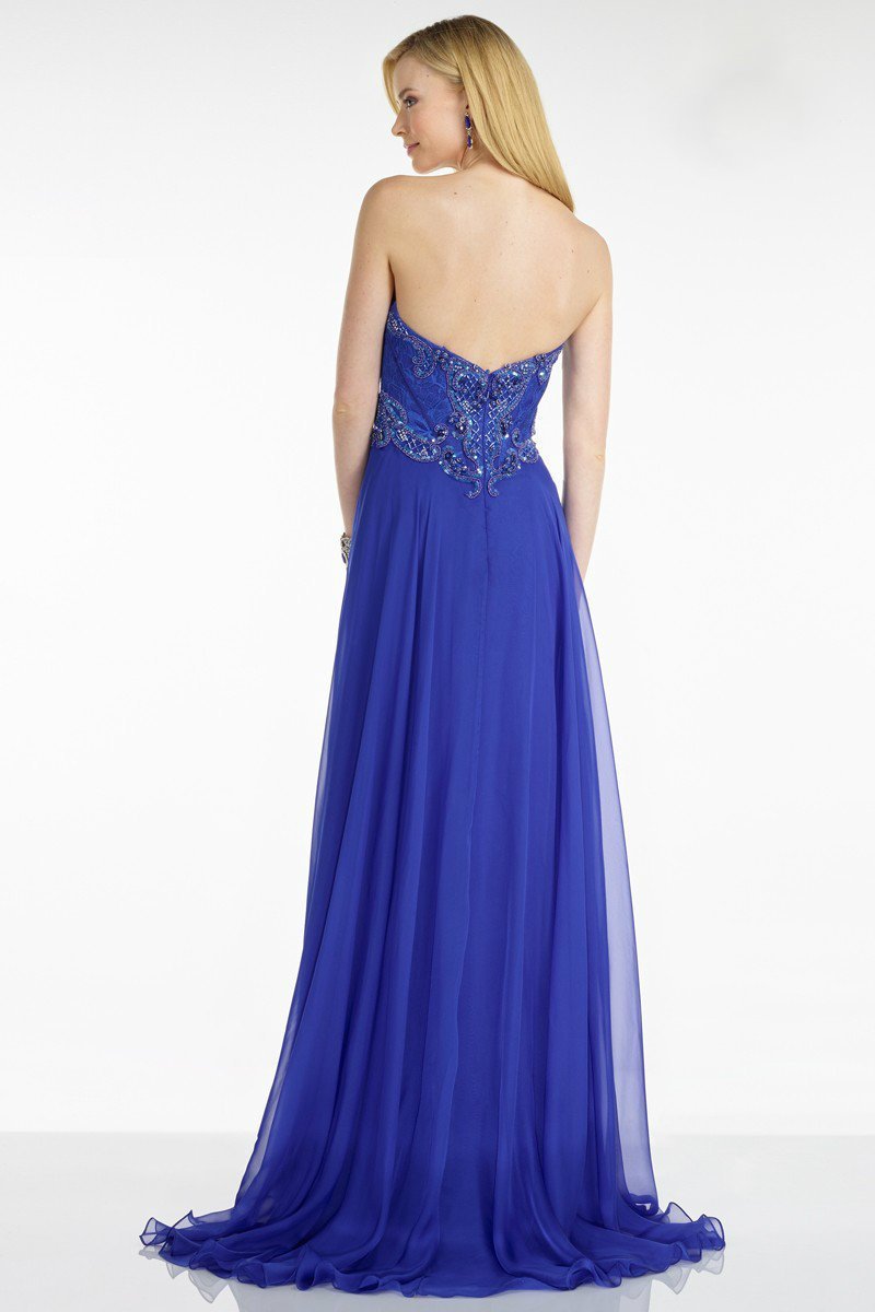 Steal the show in this ravishing silky chiffon dress with a strapless sweetheart neckline and a sequin bodice.