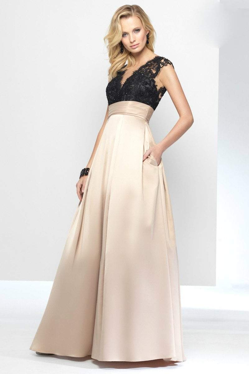 Princess style dress with a stretch satin skirt and a lightly beaded laced illusion capped sleeve top with a deep v back.