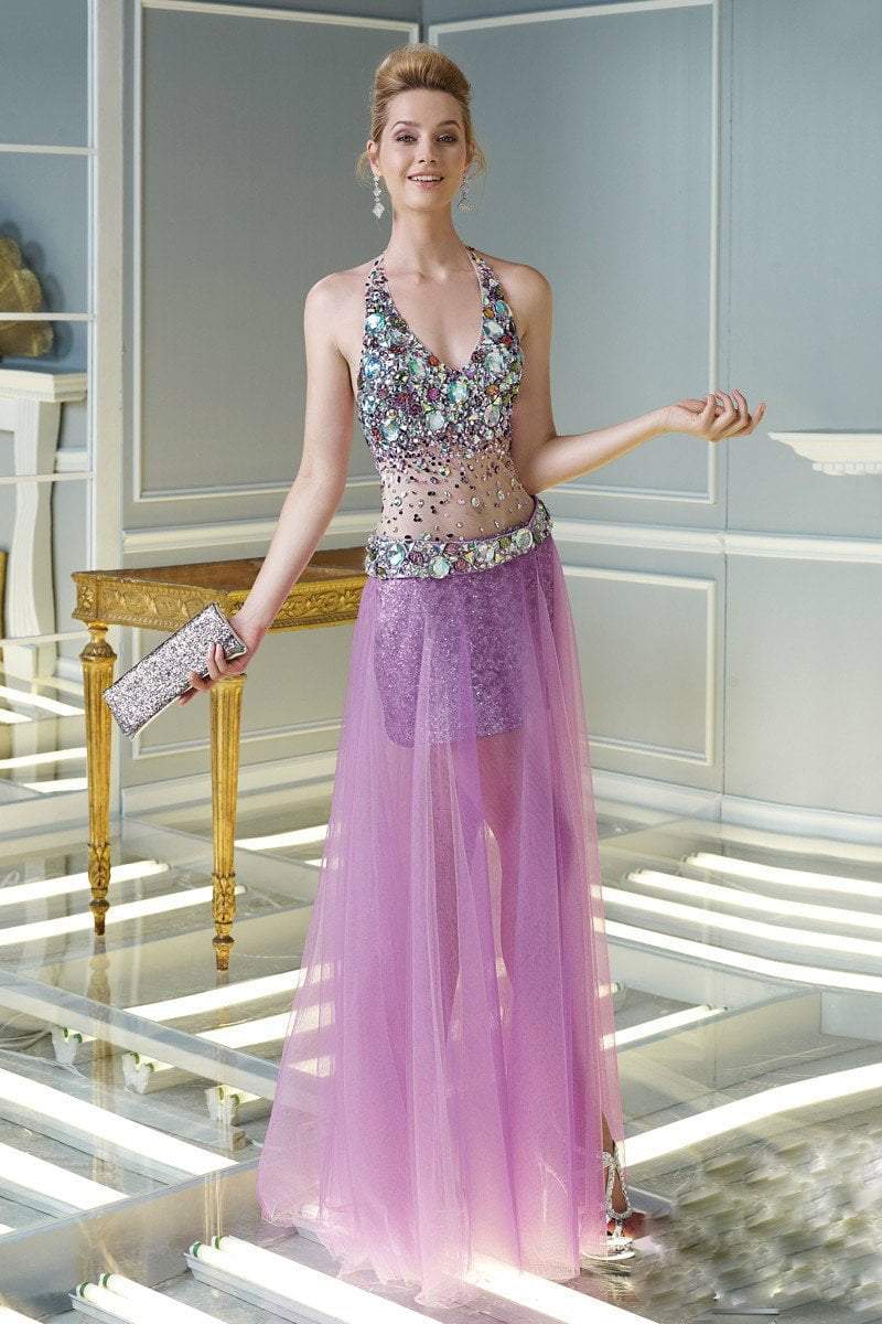 Halter neck short dress featuring detachable sheer tulle long over-skirt with left side slit and hand sewn stones on waistband. Dress also showcases a fully beaded stone bodice, an illusion waist, as well as a fully sequined short skirt.