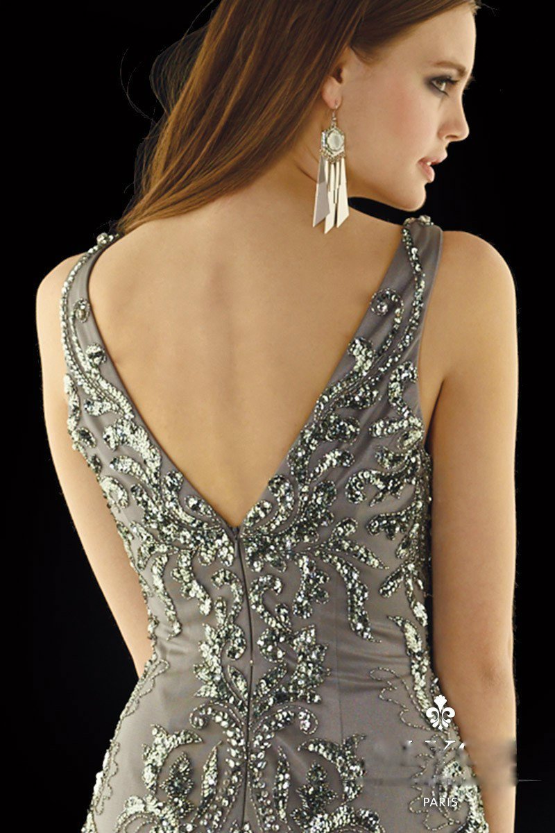 Classy and undeniably chic, this sleeveless cocktail dress will dazzle everyone with the beautiful intricate beaded tulle, gorgeous v-neckline and low back.