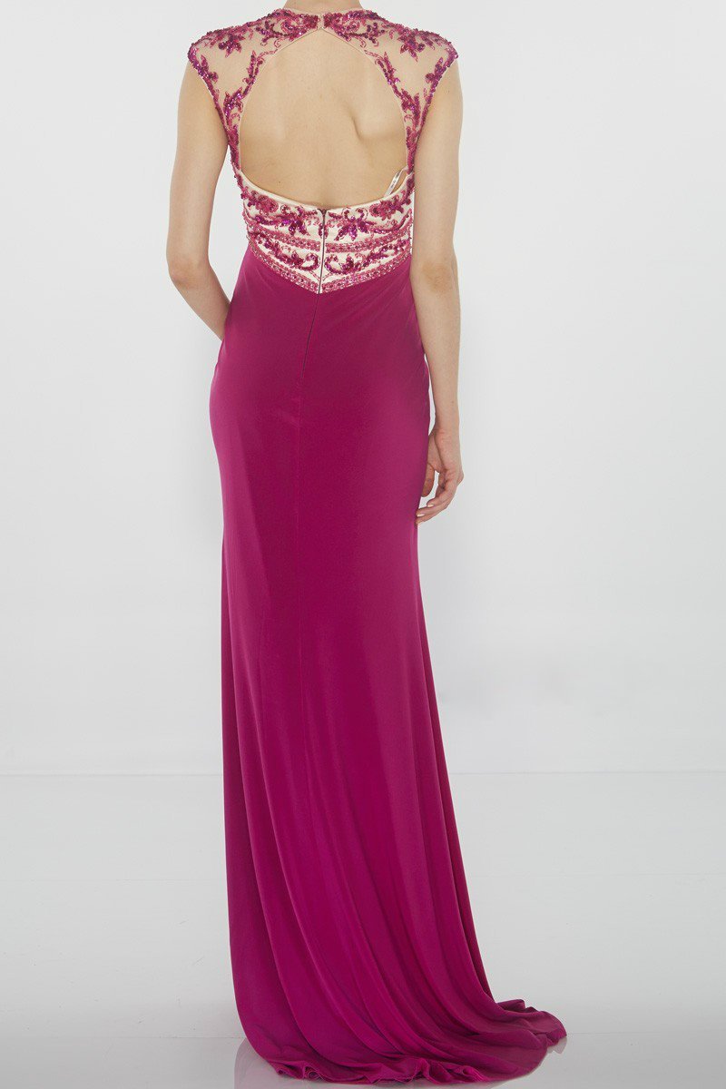 Outstanding cap sleeve slim fit jersey long gown with sweep train featuring a gorgeous beaded bodice, illusion cut-out top, sweetheart neckline, and open back.