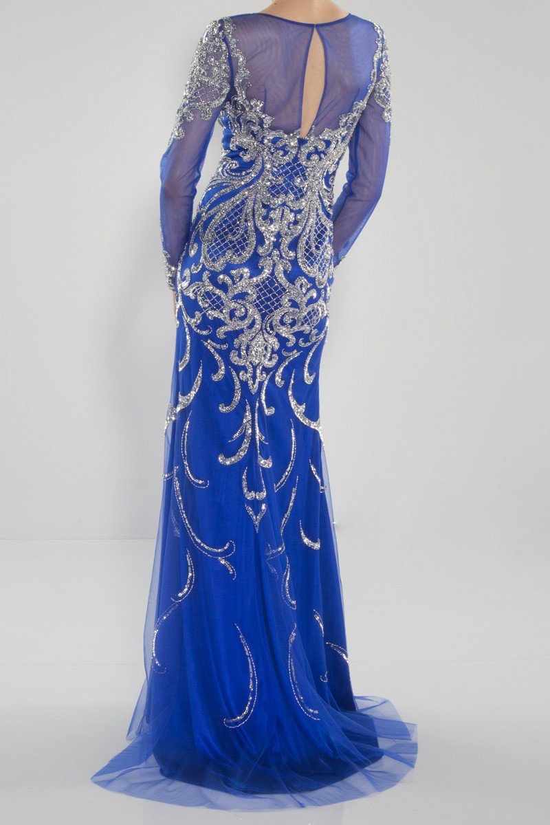 Look regal in this sheer long sleeve beaded tulle floor length gown with eyelet open back detail and slight train.