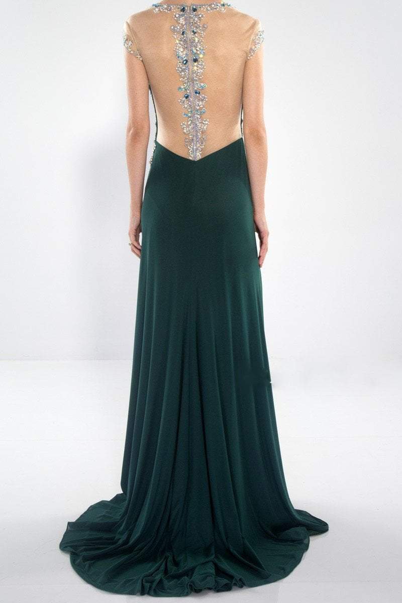 Wow everyone in this beaded stones long gown with sweep train! Features sheer beaded cap sleeves, sweetheart neckline, cut-out detail between beaded ruched bodice, open back, and sexy high cut front side slit.