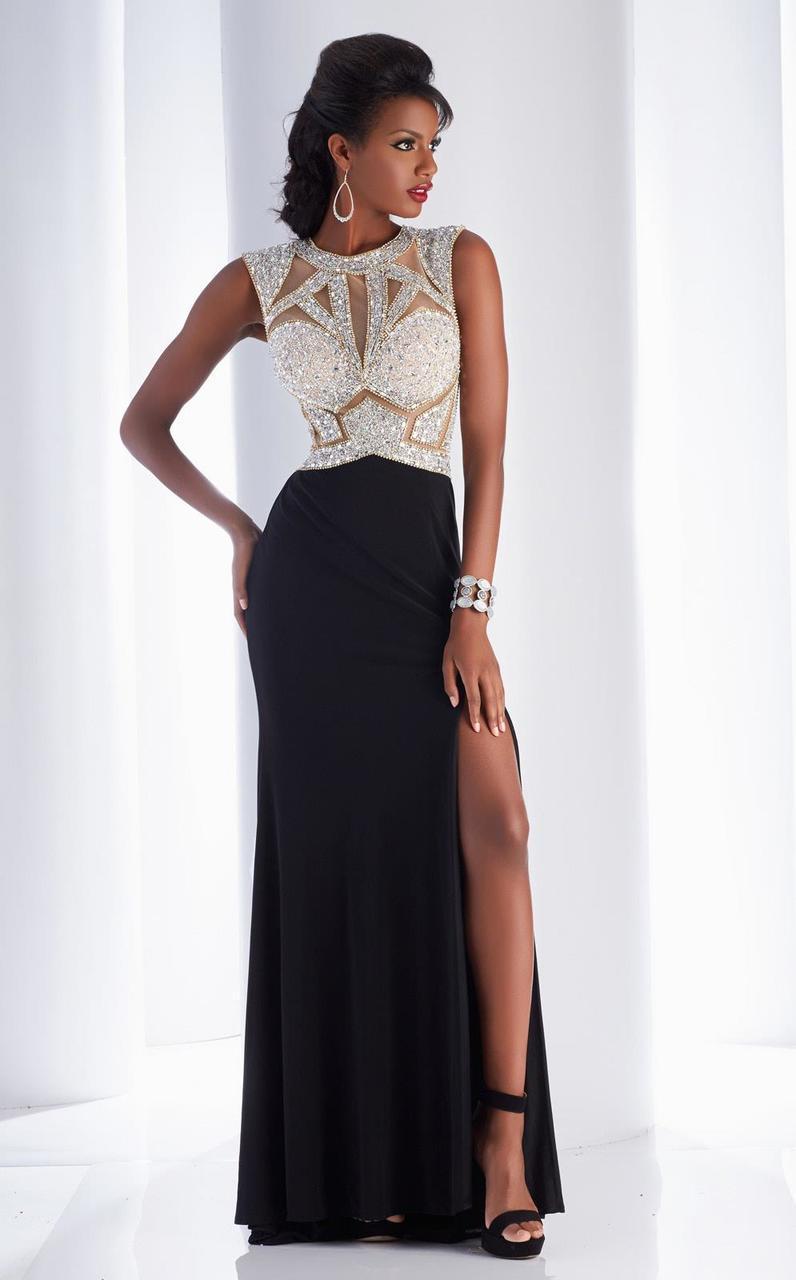 Look brilliantly stunning for your next after 5 occasion in this Clarisse 4725 evening gown. This dress has cap sleeves and covered with solid geometric blocks of iridescent and gold beadwork, creating unique cut out designs. Contrast fabric creates a smooth flowing skirt with a slit at one side. This gown is full length and has a small train in the back and side slit in the front. The extra dash of sultriness in this daring, red carpet ready Clarisse gown is simply captivating!