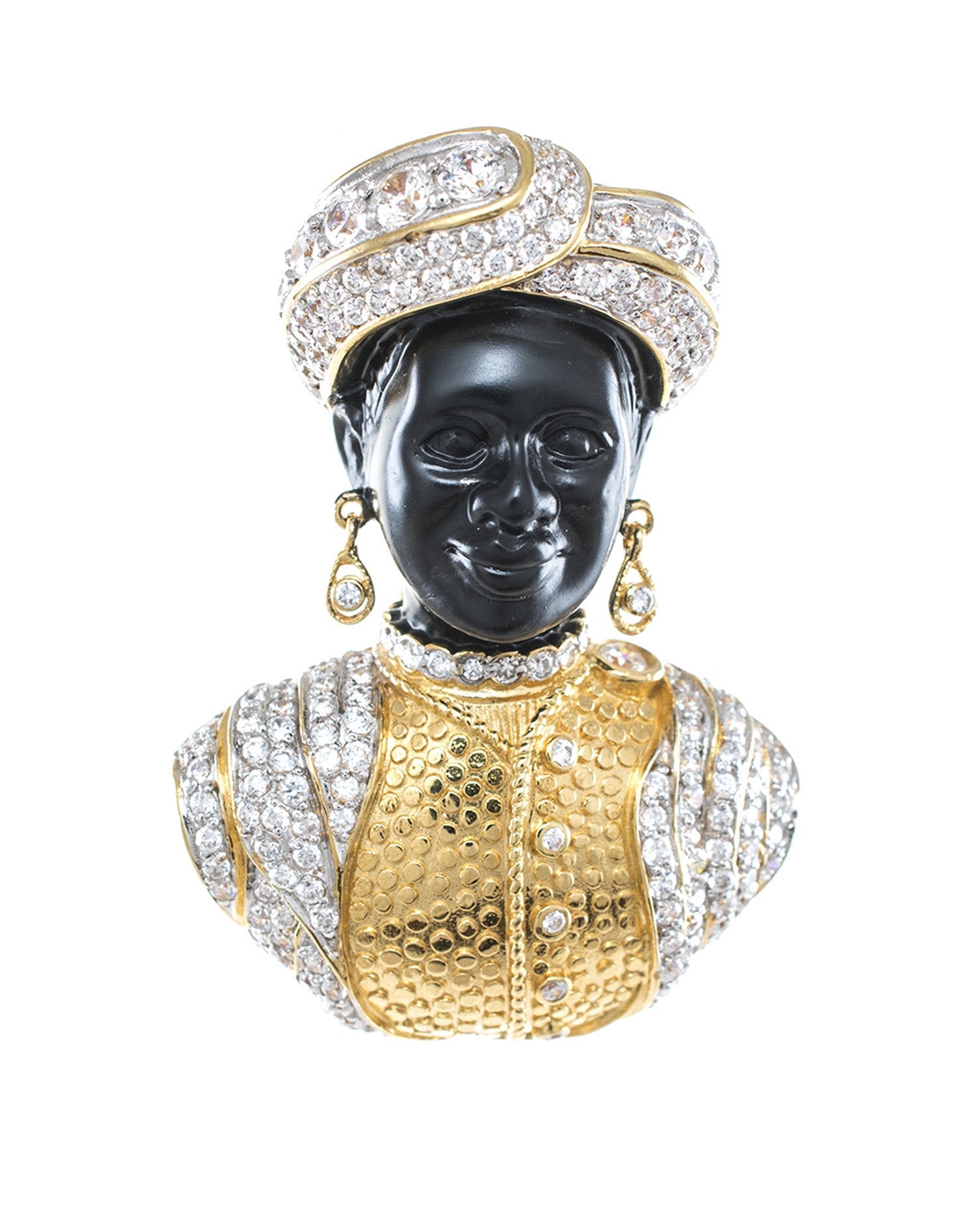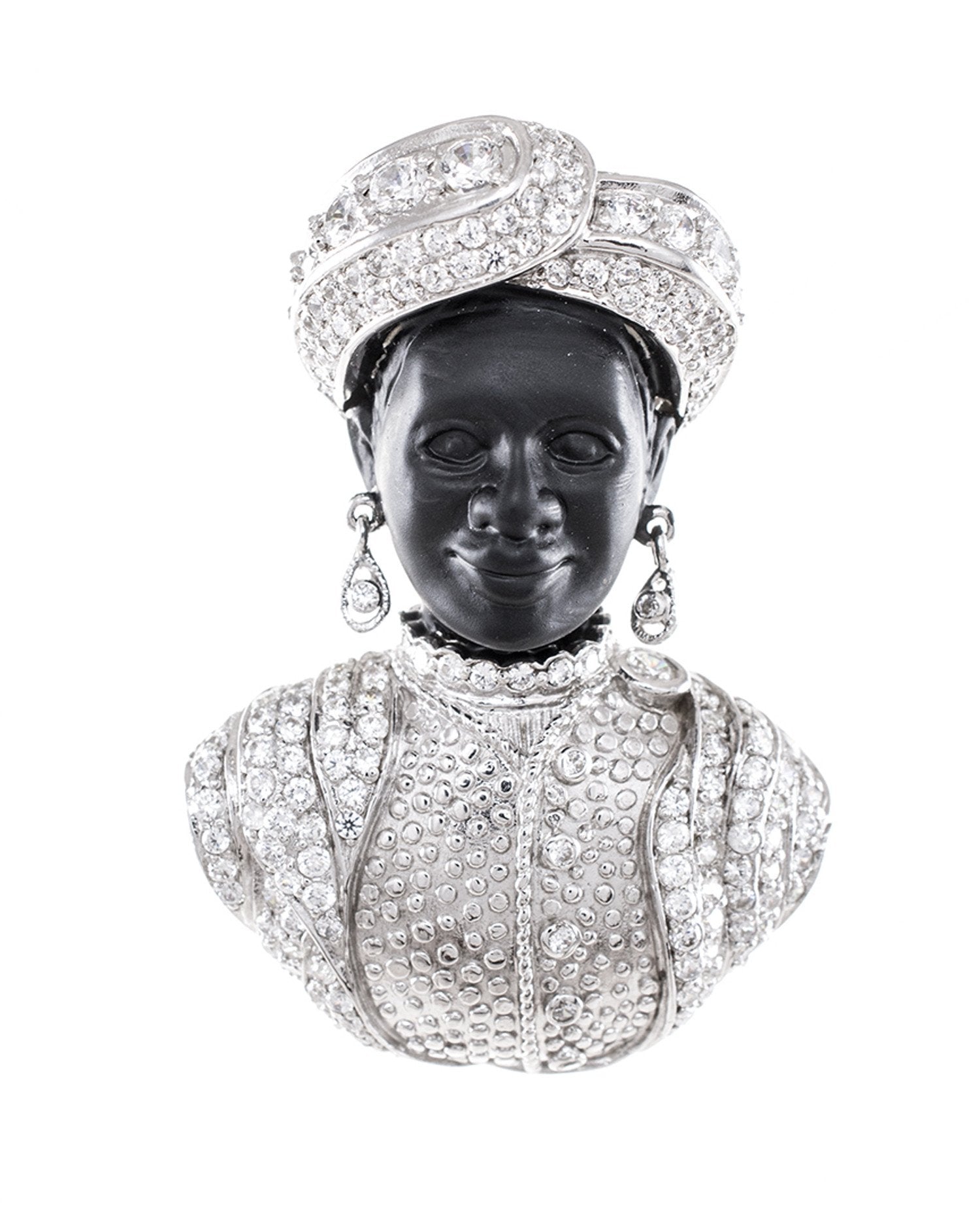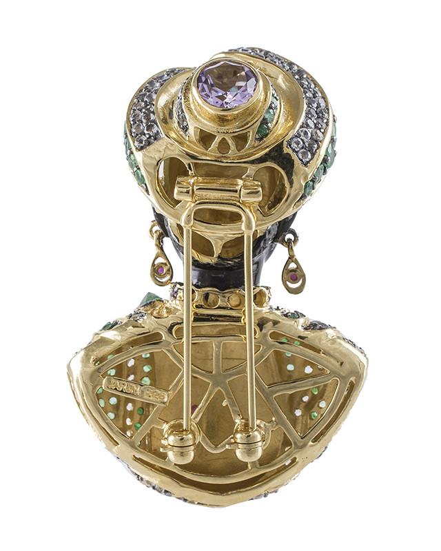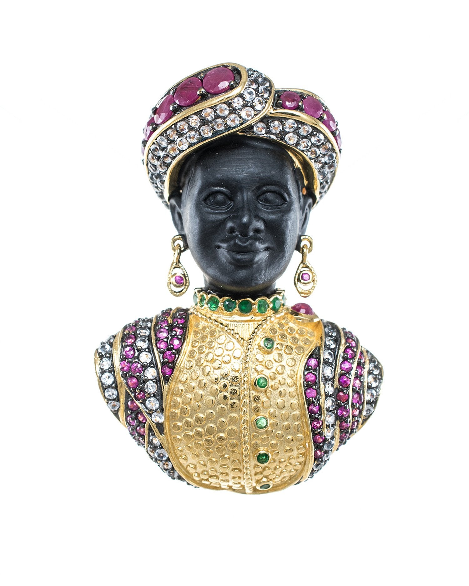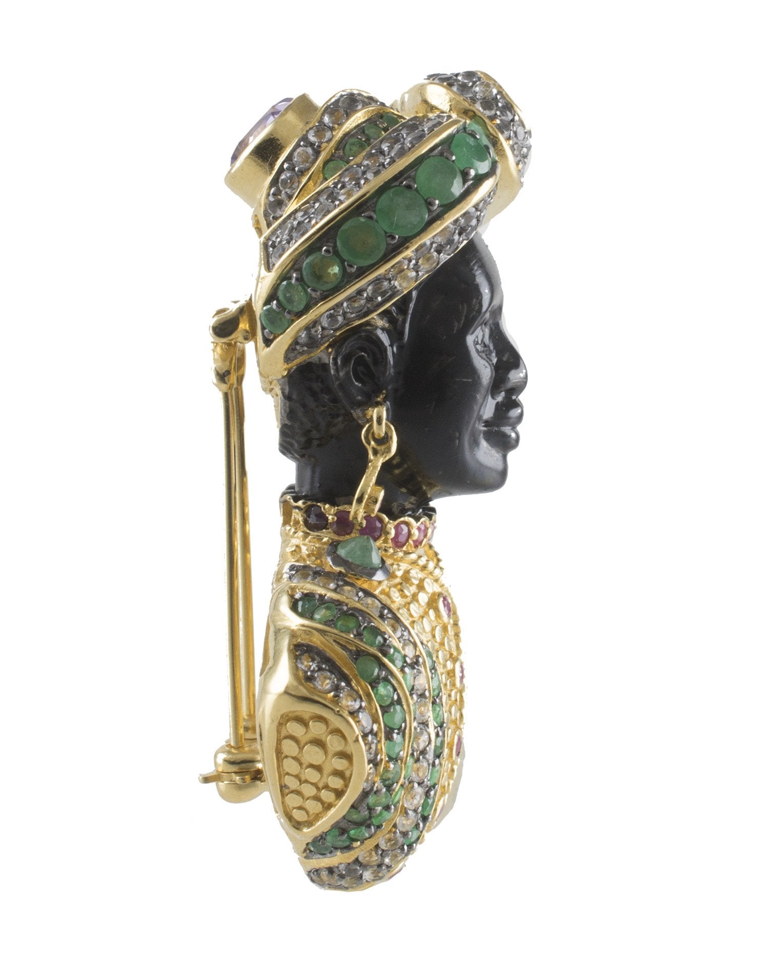 Venetian-style Sterling Silver brooch in the Blackamoor style adorned with emerald, topaz, fresh water pearl, ruby and diamond simulants.