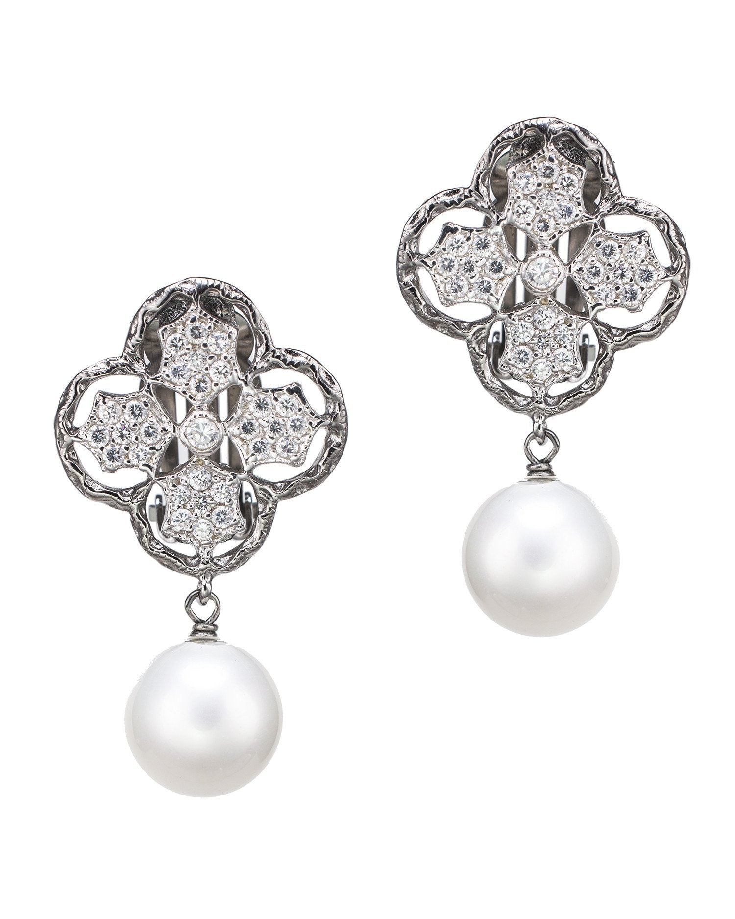Clip Romantic Lace Clover earring with a drop shell pearl.The centers of each clover leaf are paved in hand cut and hand set diamond simulants.