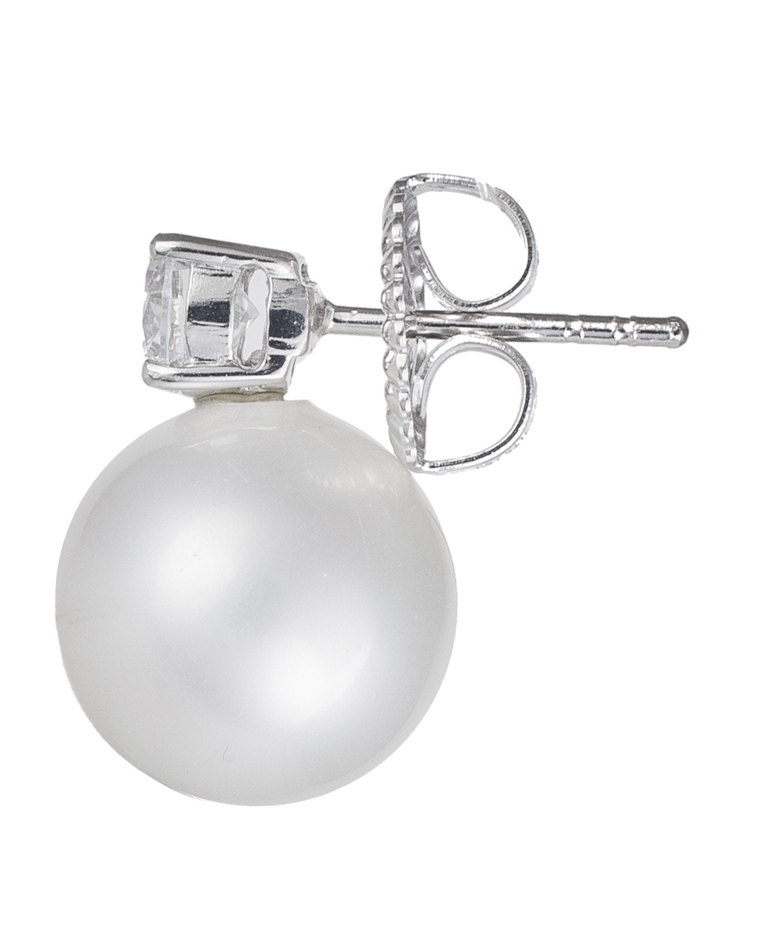 Traditional and classic. Sterling Silver pierced earring featuring a 12mm shell pearl topped off with a shimmering diamond simulant.