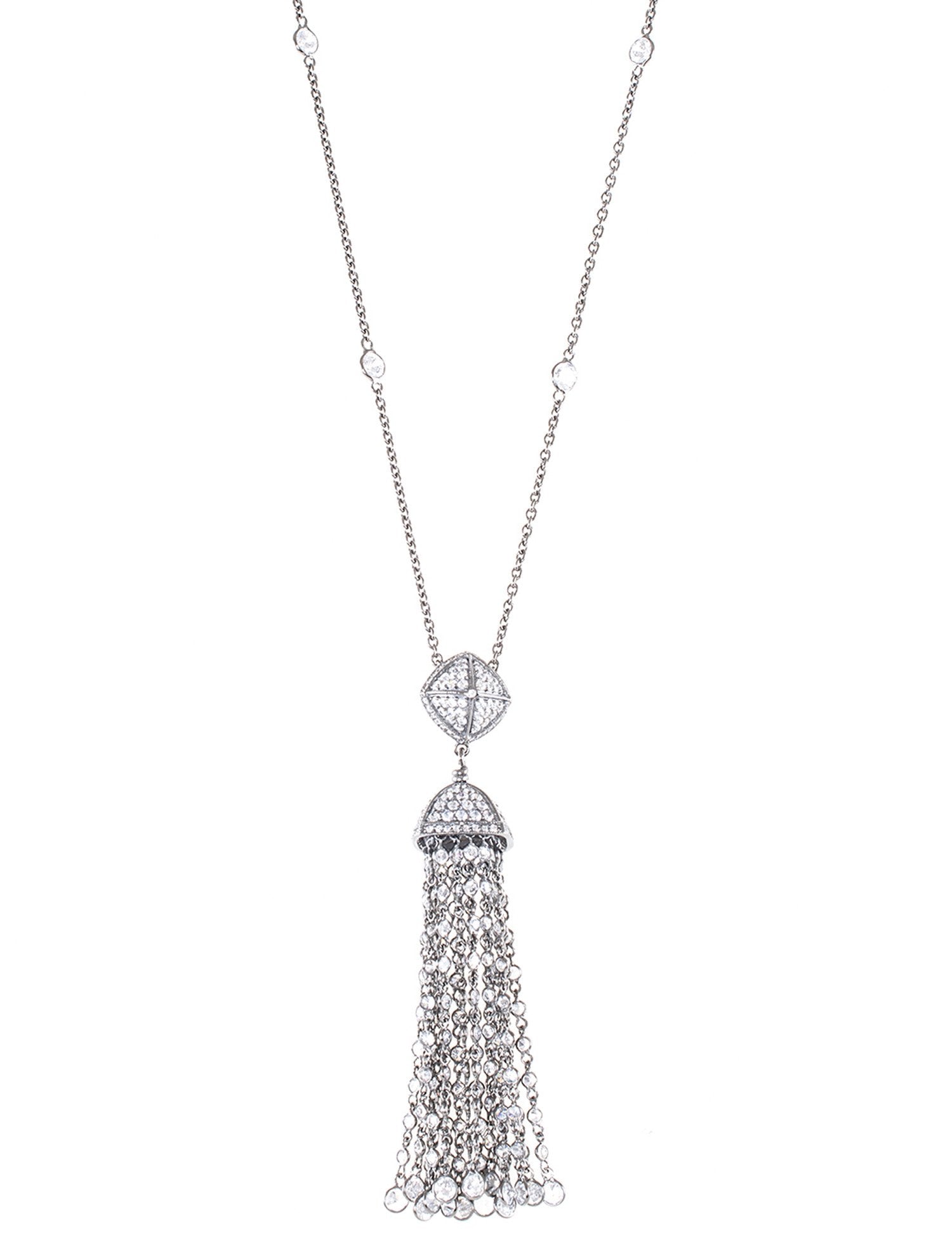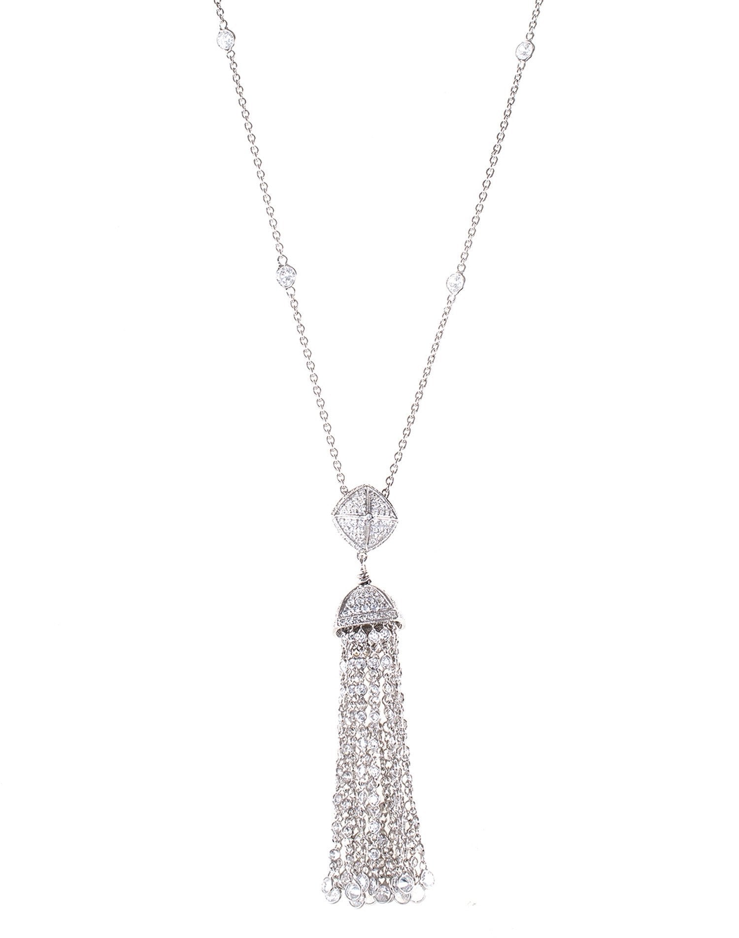 This Sterling Silver tassel hands from the bottom of a classic diamond by the yard necklace to create a dash of elegance.