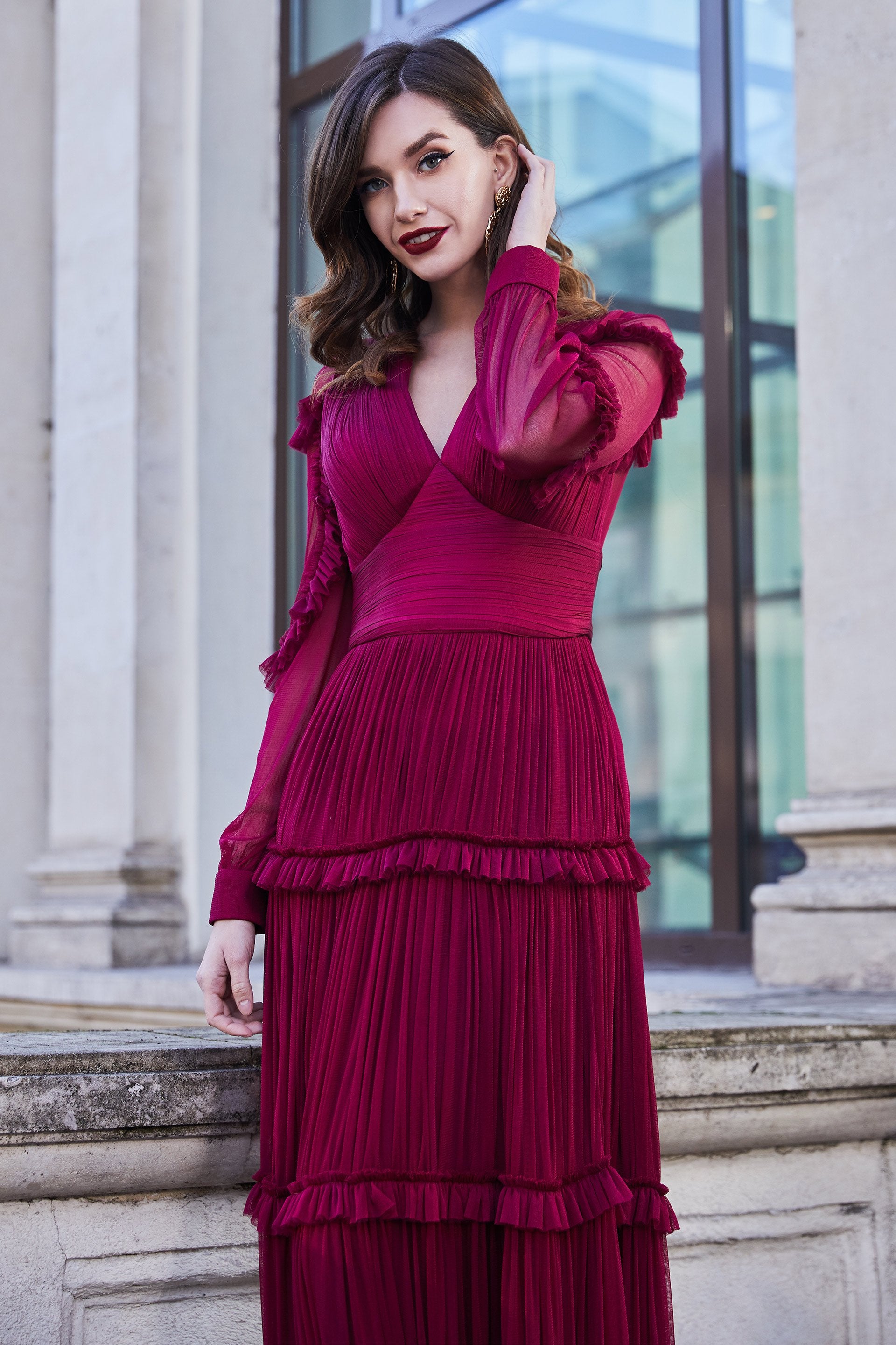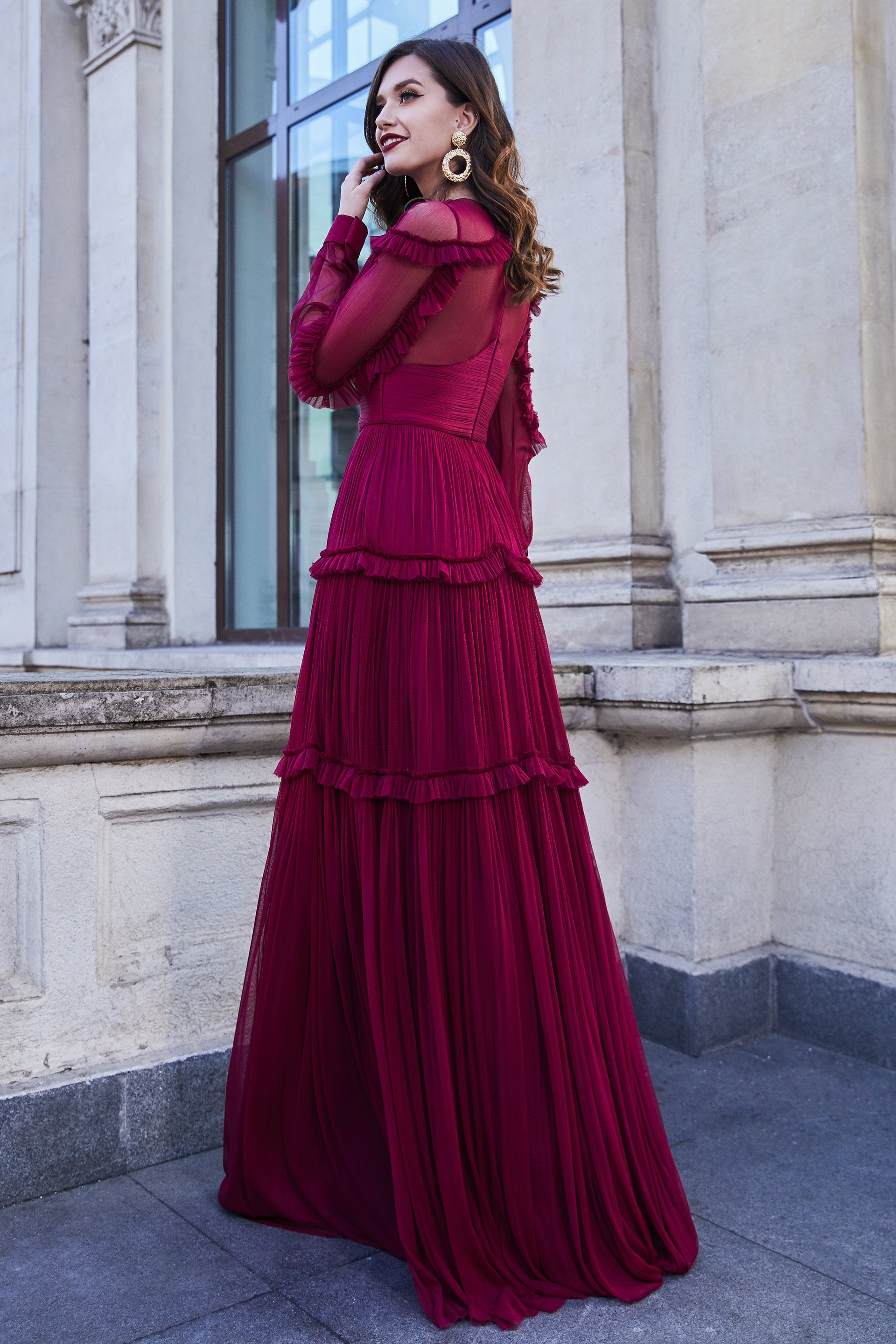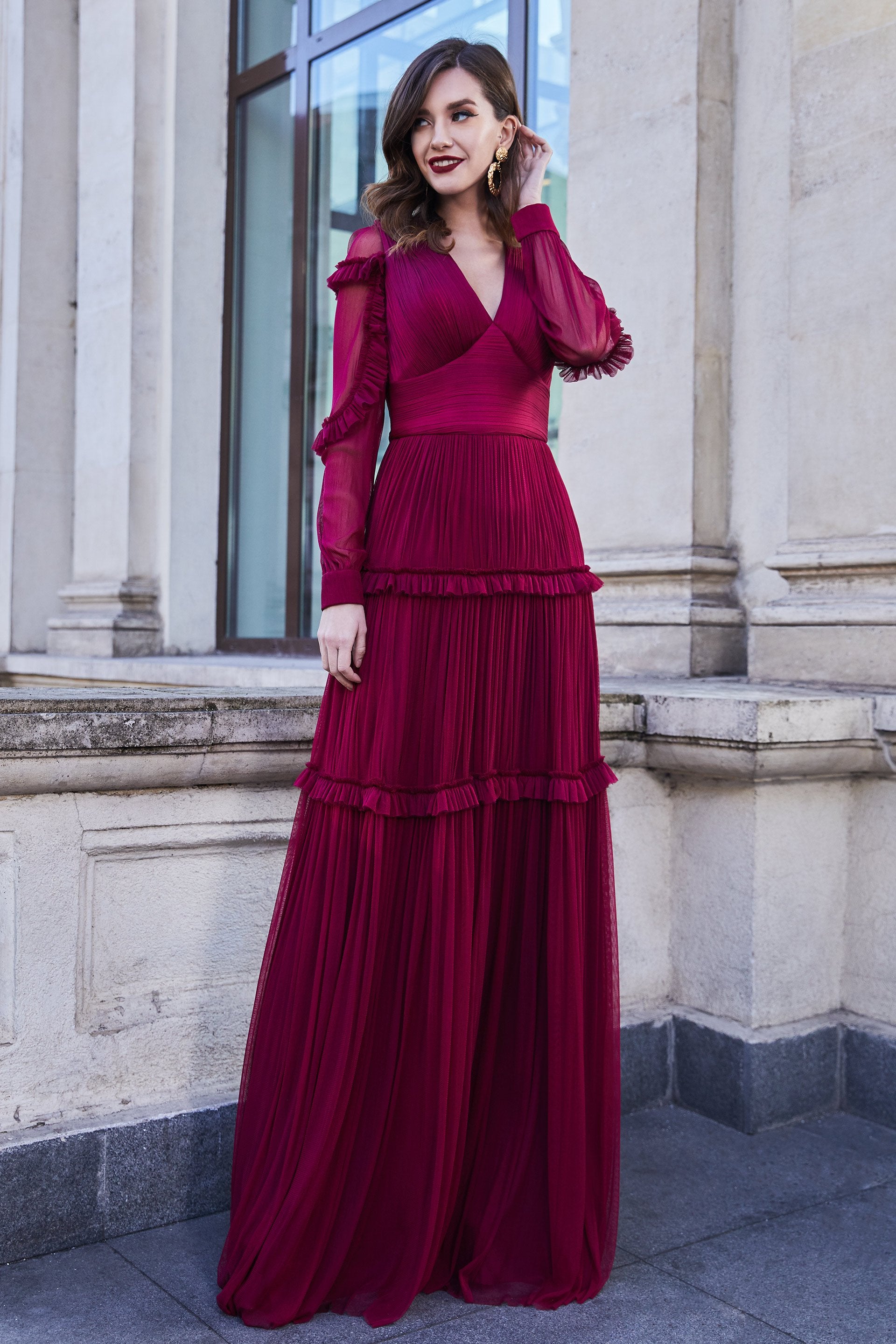 Look jaw dropping in this dramatic dress by Cristallini SKA966. This creation is a stunning handmade plisse silk tulle full length gown with V neckline and semi-sheer long sleeves and back with gathered ruffles that adorns the sleeves and the skirt. The bodice is fitted with sectional lines highlighting a fitted midriff leading to the flowy full A-line skirt. Be dressed up gorgeously in this captivating evening dress by Cristallini. Model is wearing Bordeaux color.