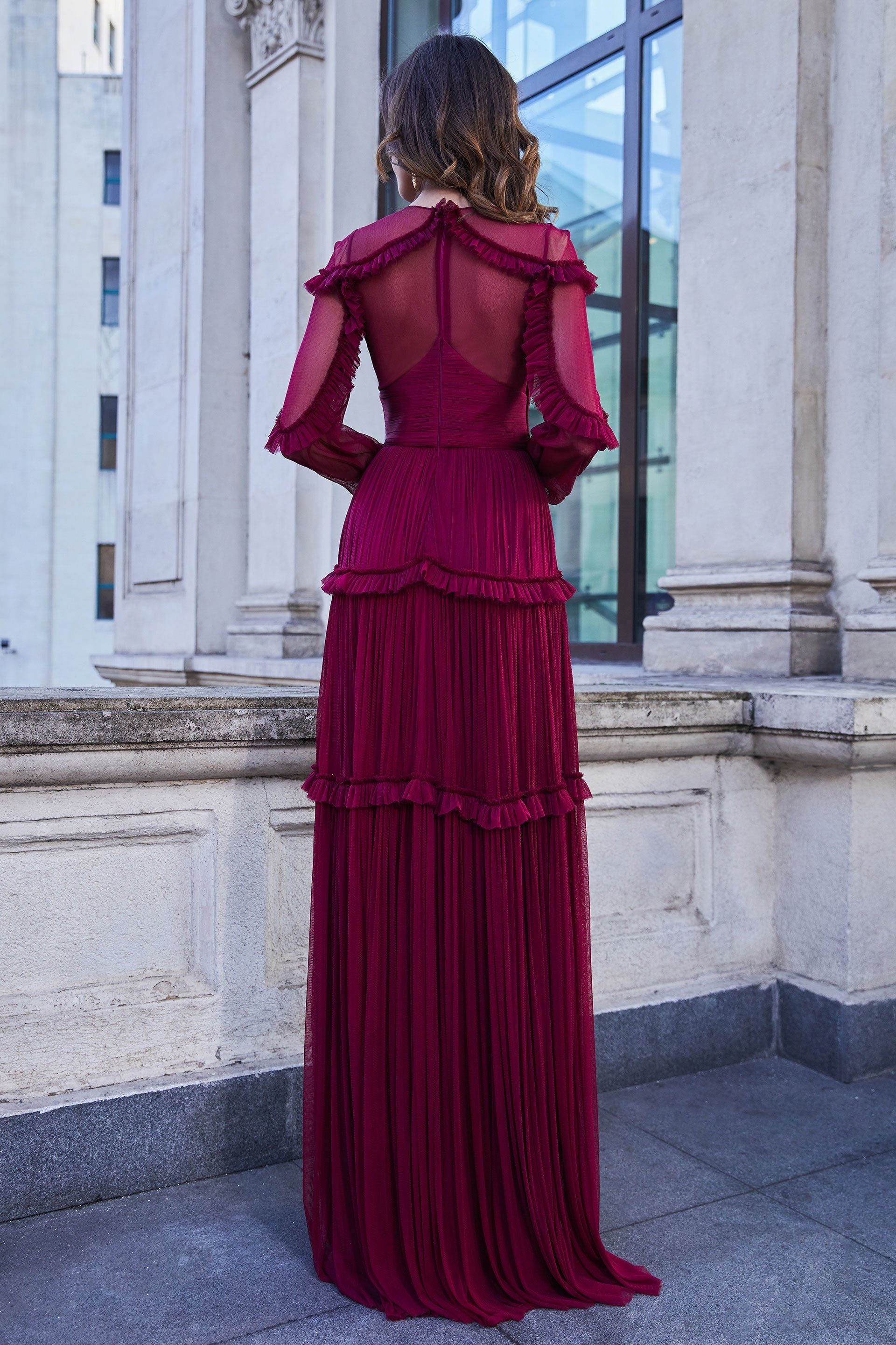 | Details: | Handmade plisse 100% pure silk tulle , 100% polyamide tulle – Italy, Ruched bodice, Silk fabric lining, Sheer back and sleeves, Long sleeves, Long skirt with slit, Ruffled details, Back zipper closure |