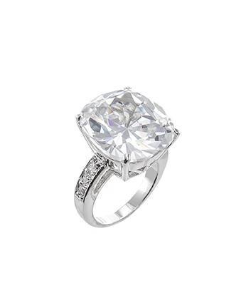 15 CTTW cushion cut diamond simulant ring with pave band. Hand-cut and prong set stone.