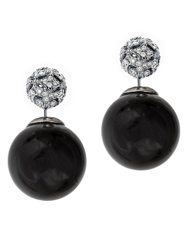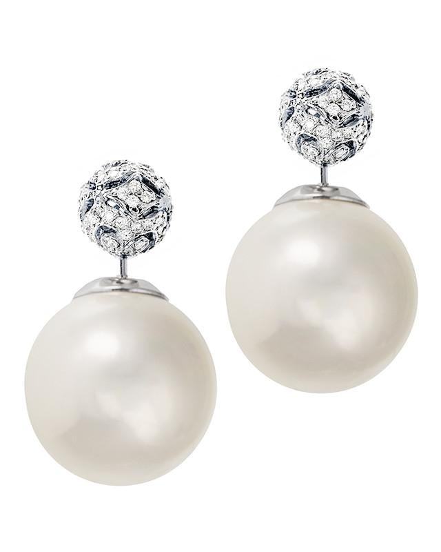 Seen on the runways and red carpets around the world, this pierced tribal earring is made of shimmering shell pearls paired with a delicate lace design and a platinum finish. A romantic twist on a hard edge style. Set with hand cut cubic zirconia this earring is sure to impress.