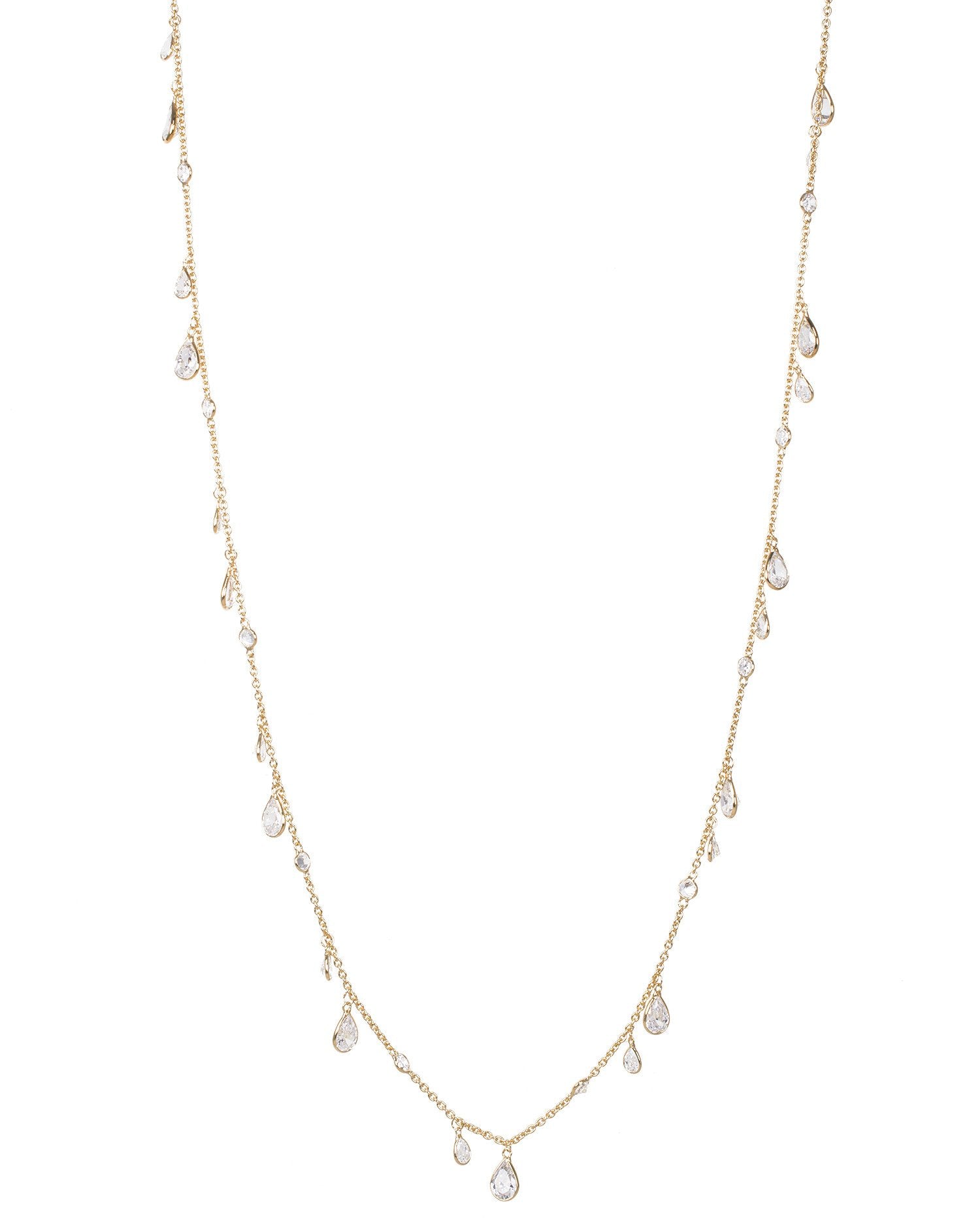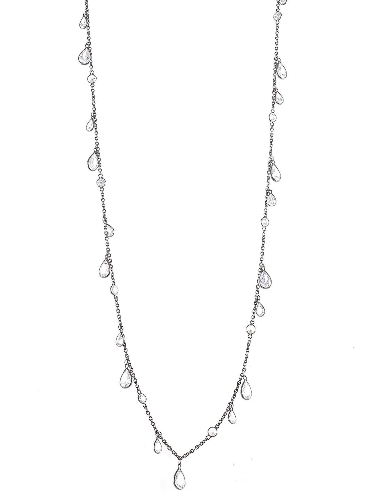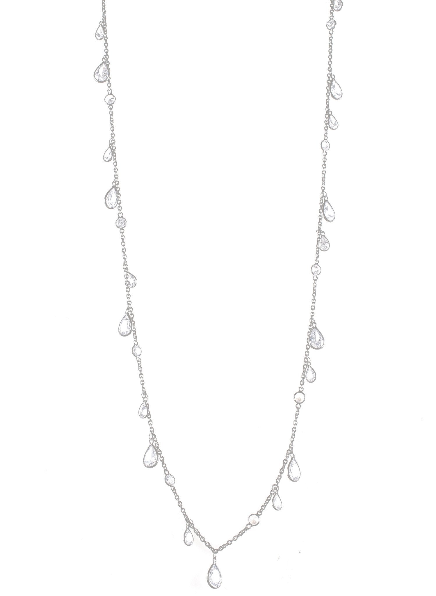Jarin K's take on an updated Diamonds-by-the-yard. Sterling Silver hand wrapped pear shaped diamond simulants twinkle as the swing from the diamond studded chain.