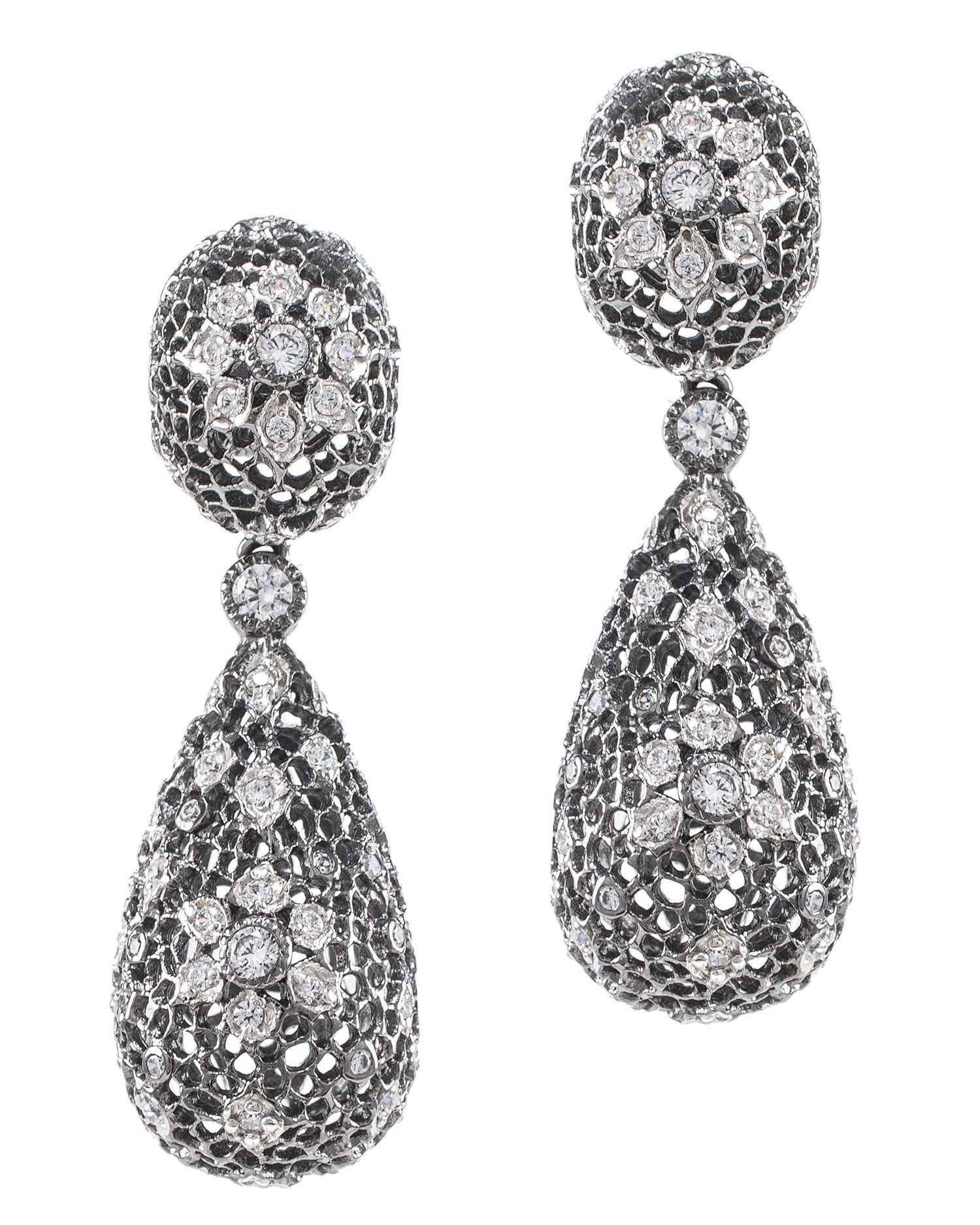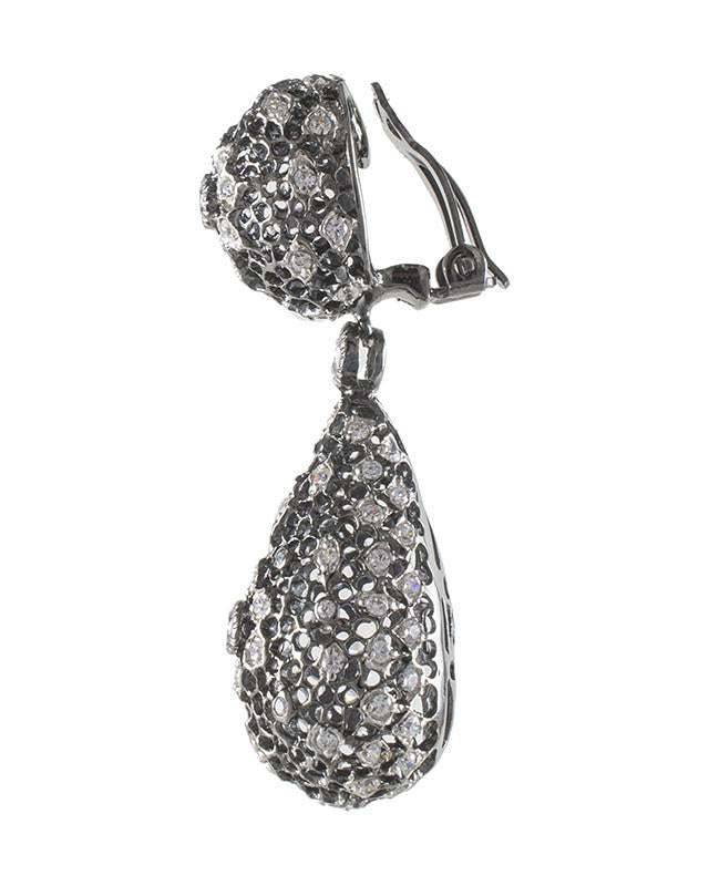 Small clip earring in the classic Floral Lace design. Oval button on the ear with a beehive drop. The flower petals are set with hand cut diamond simulants.