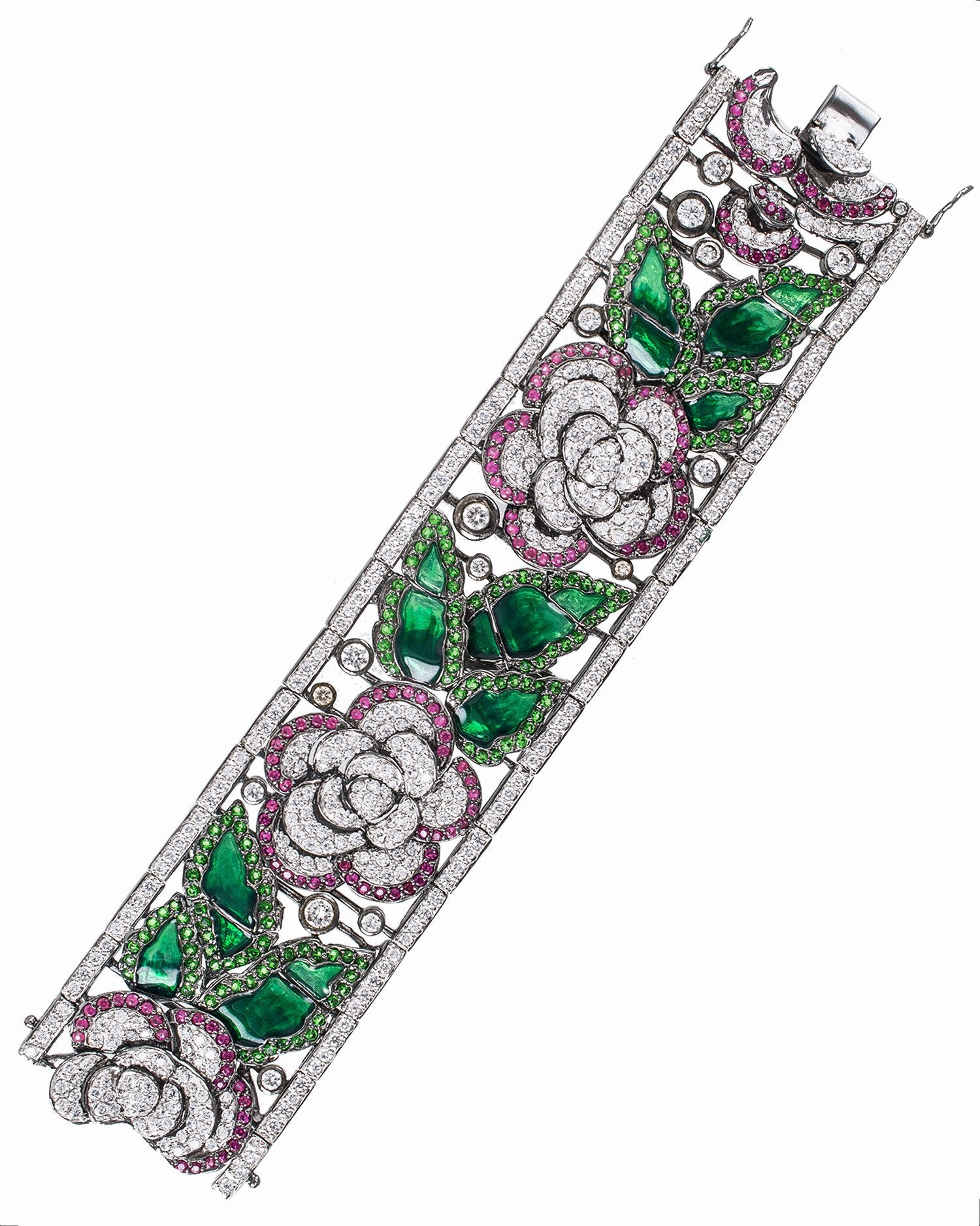 Art Deco Paris is the inspiration for this unique "placque" bracelet that showcases beautiful enameling as well as the Jarin K's selection of the finest hand cut diamond simulants. A true "modern antique".