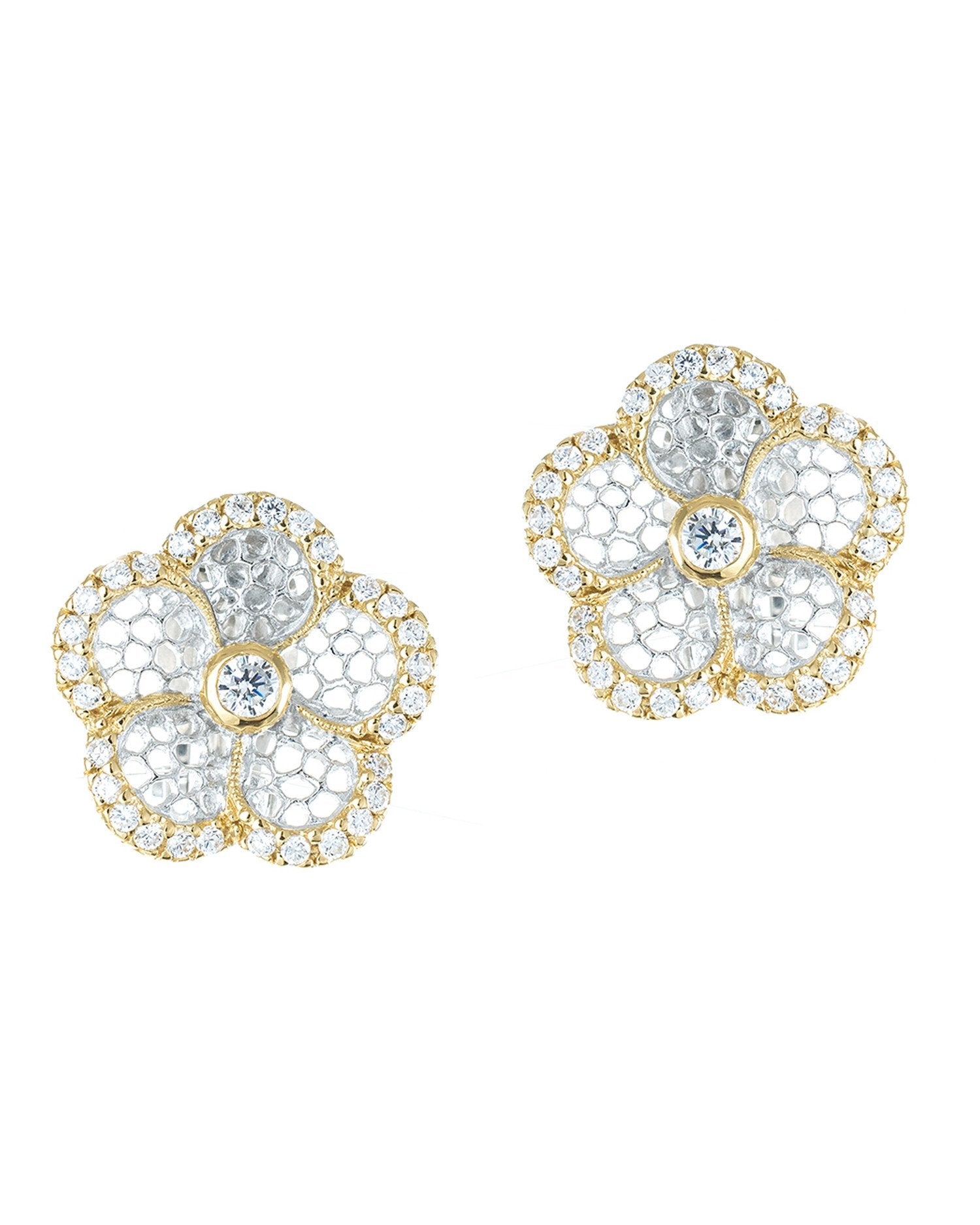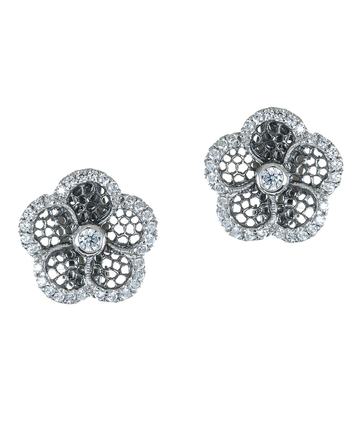 Classic clip button style earring in an enlarged version of the floral design featured in the Floral Lace pattern. The motif is accentuated with hand cut and hand set diamond simulants.