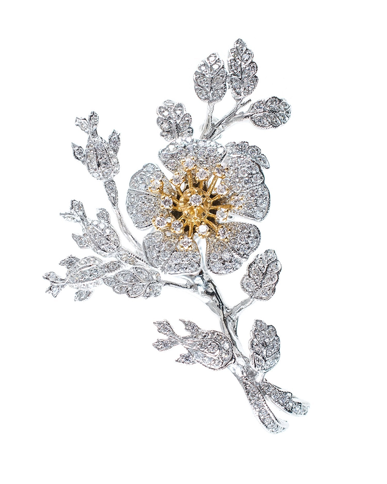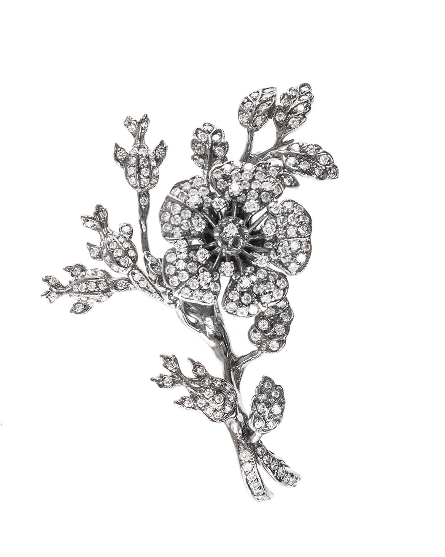 The French royal court is the inspiration for this mini tremblant floral brooch. Paved in hundreds of the finest diamond simulants this brooch's flower actually "trembles" as you move. The flower is set on a tiny hand made spring which allows it to "tremble" as you walk or dance.