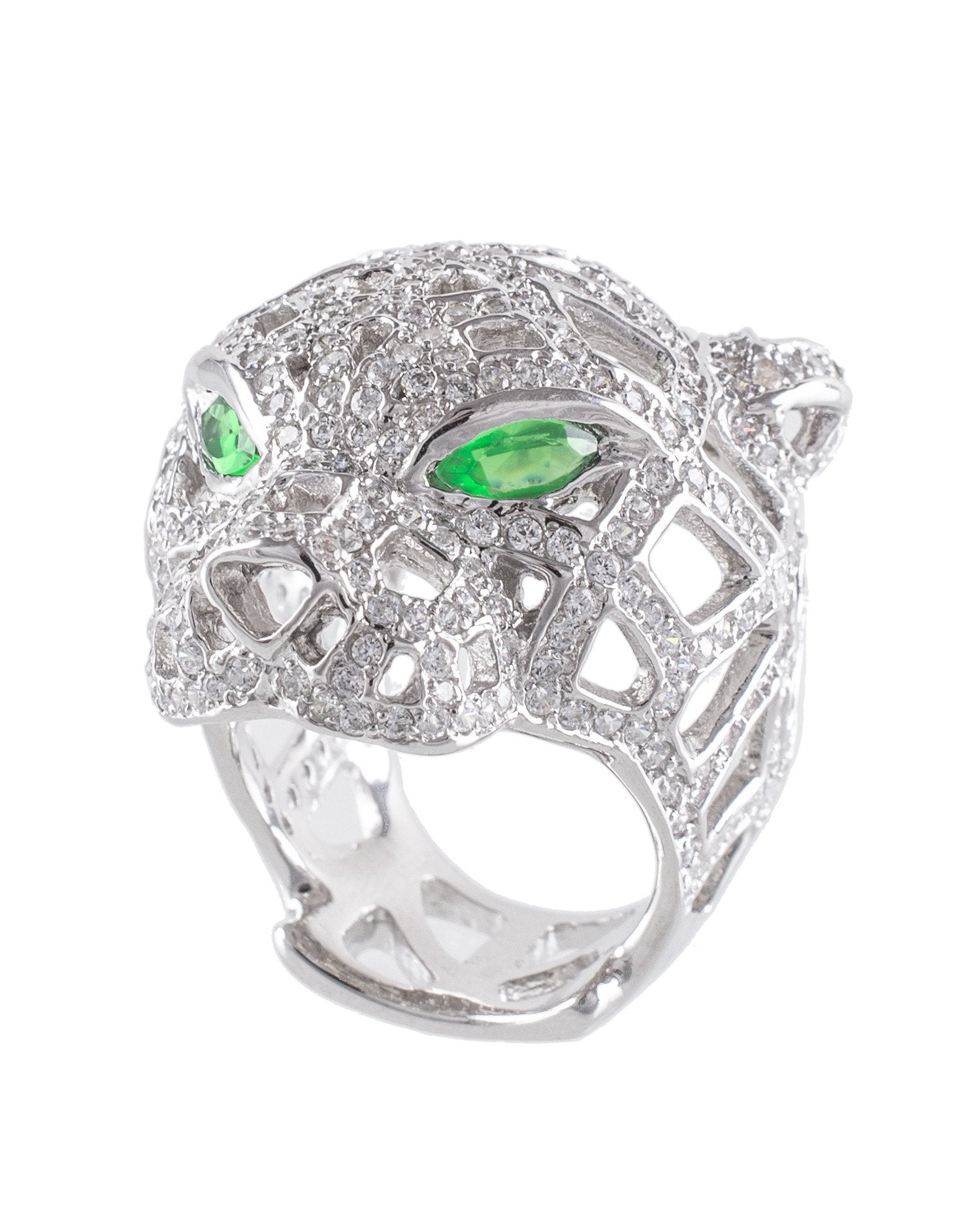 This panther inspired Sterling Silver ring features a geometric design and simulant emeralds with hand cut and hand set diamond simulants .