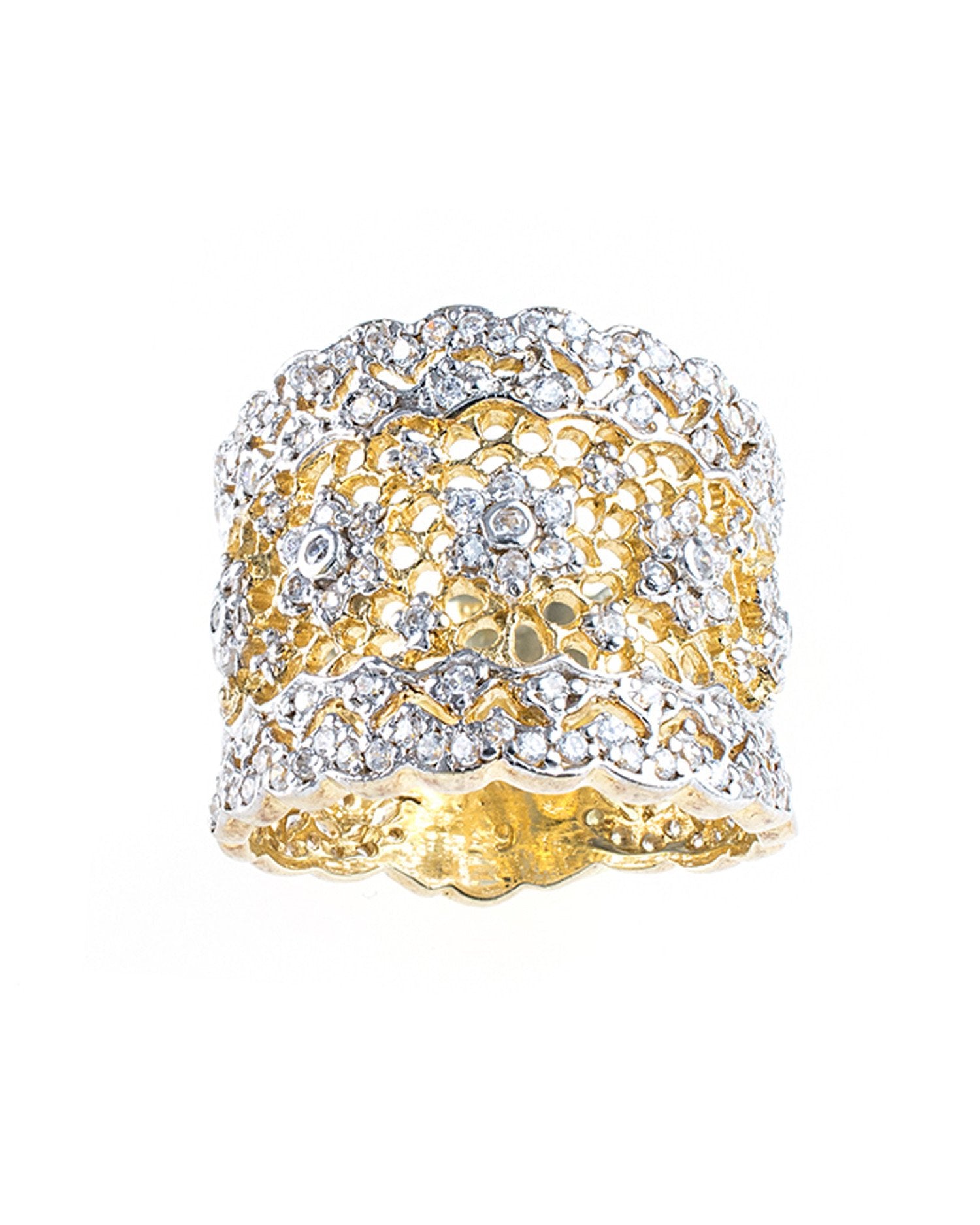 This beautiful Sterling Silver tapered "cigar band" style ring is in the classic Floral Lace design. The band is encrusted in the highest quality hand cut cubic zirconia. Each stone is hand set into the ring as if they were fine diamonds.