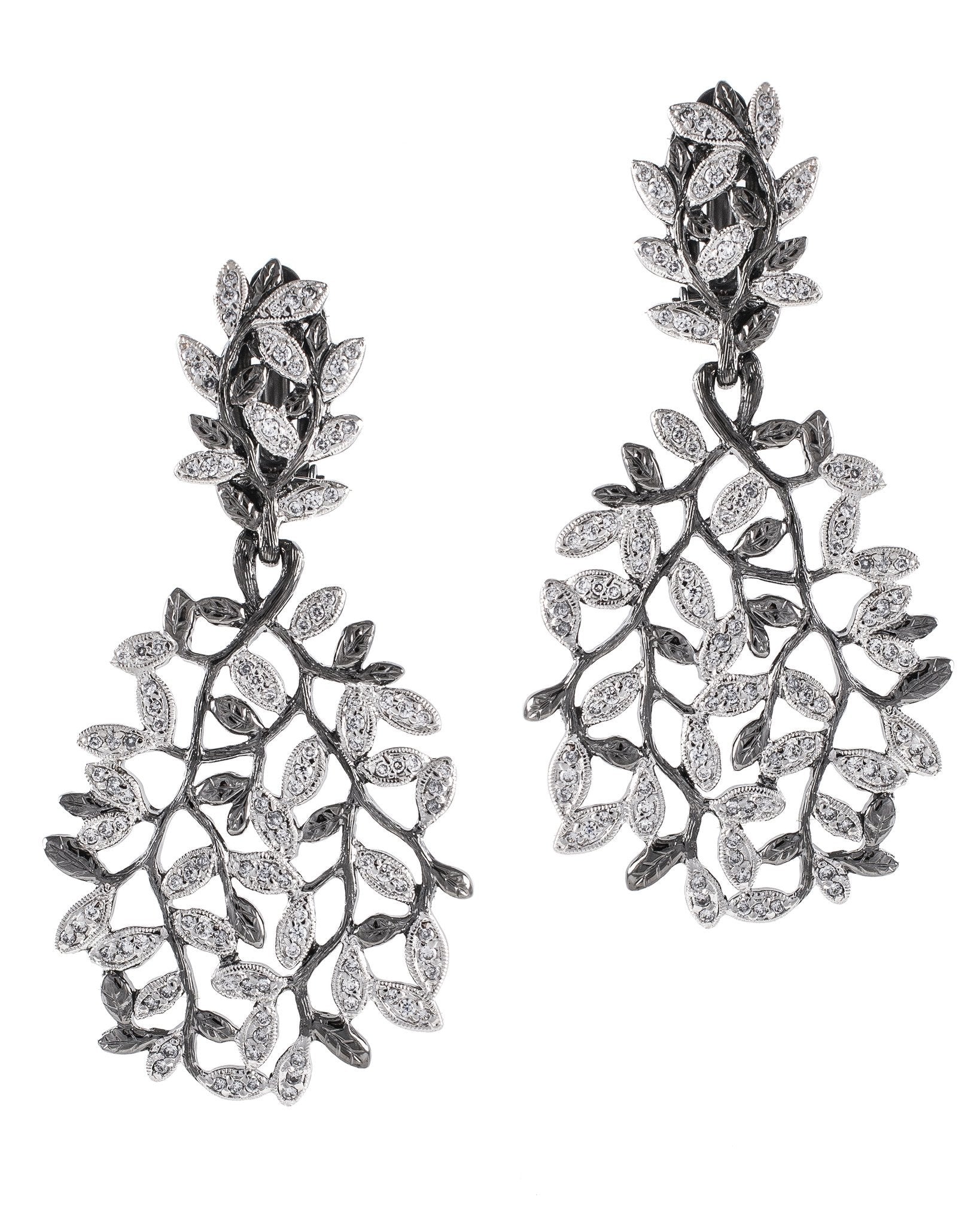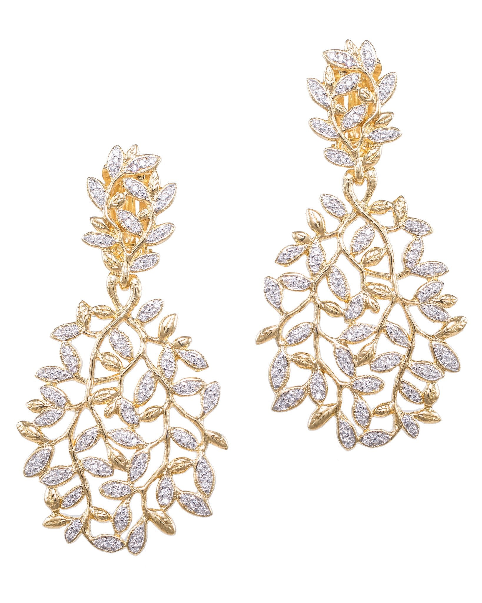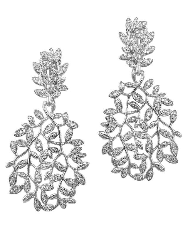 Elegant clip earrings feature an elaborate vine design and encrusted with hand cut and hand set diamond simulants. A touch of Grecian elegance.