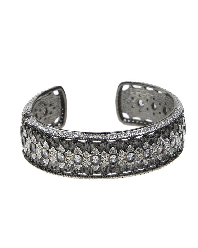 8CTTW Multi oval Cubic Zirconia narrow hinged cuff with pave stones. Set in black rhodium plated brass.