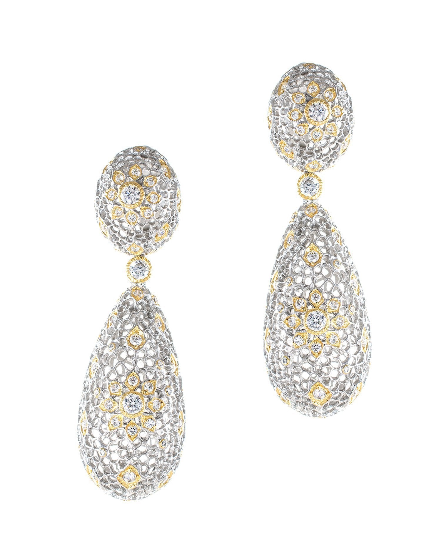 Large clip earring in the classic Floral Lace design. Oval button on the ear with a beehive drop. The flower petals are set with hand cut cubic zirconia.