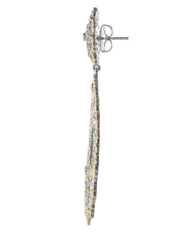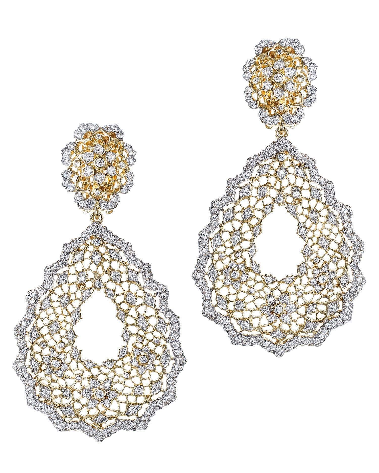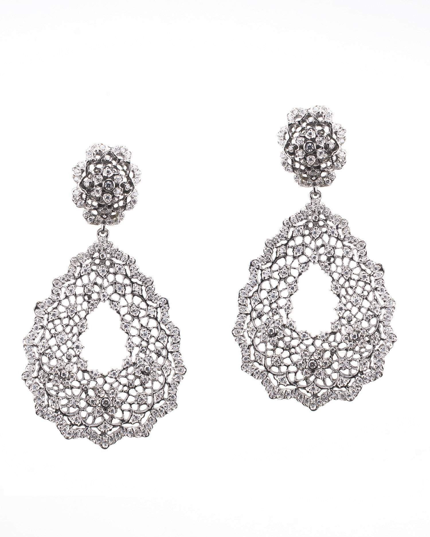 Large pierced earring in the classic Floral Lace design. Scalloped oval on the ear with an open pear centered drop. The flower petals are set with hand cut diamond simulants.
