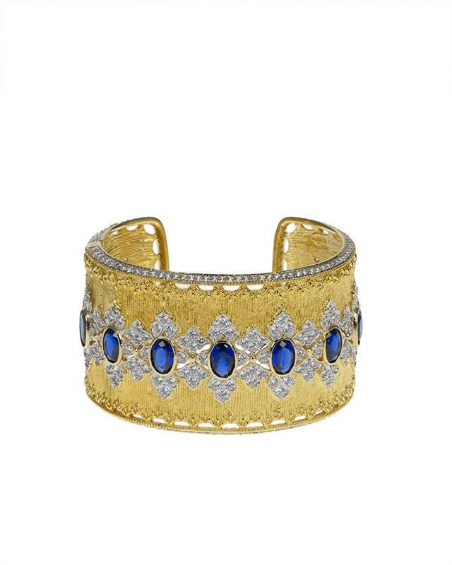 15 CTTW Oval Blue Sapphire Cubic Zirconia wide hinged cuff. Set in 18k gold plated brass.