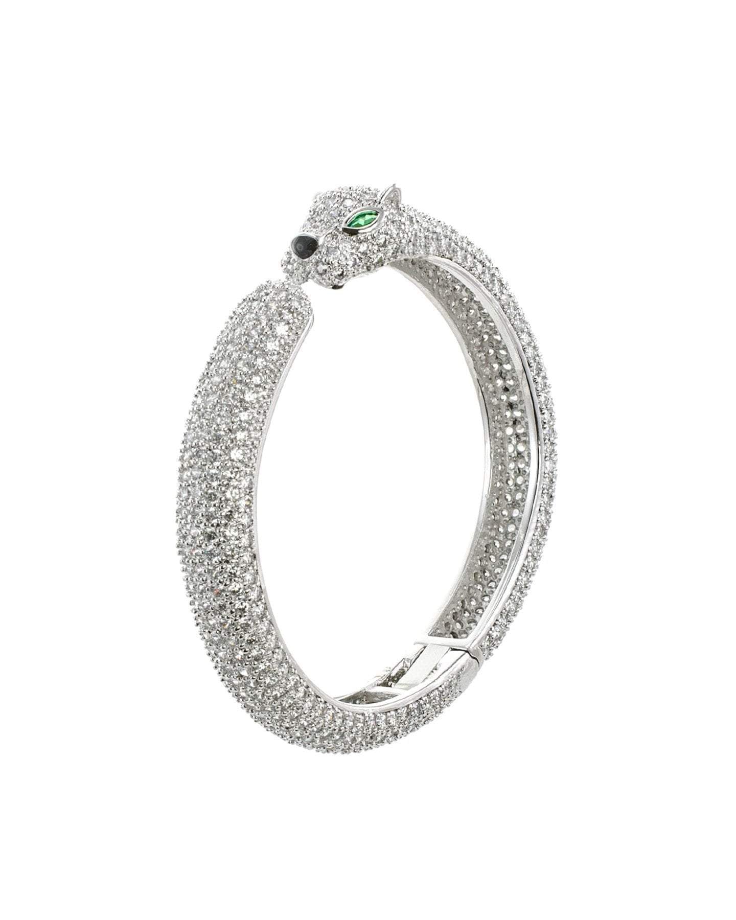 10 CTTW Pave Cubic Zirconia Panther open hinged bangle. Set in rhodium plated brass.