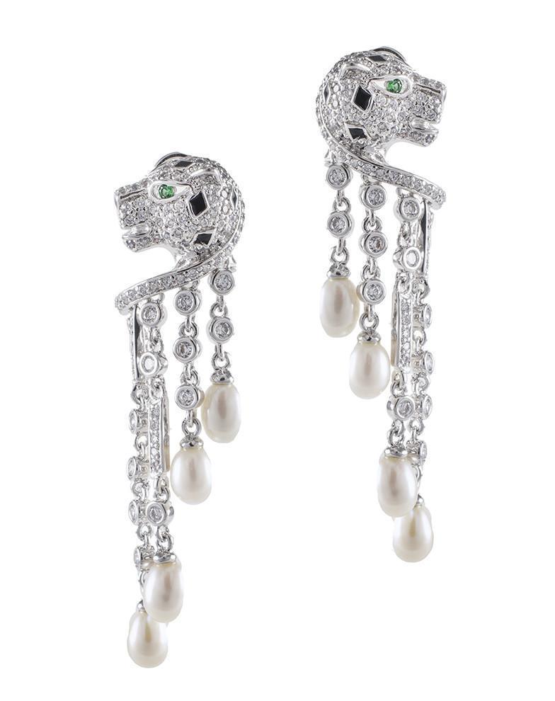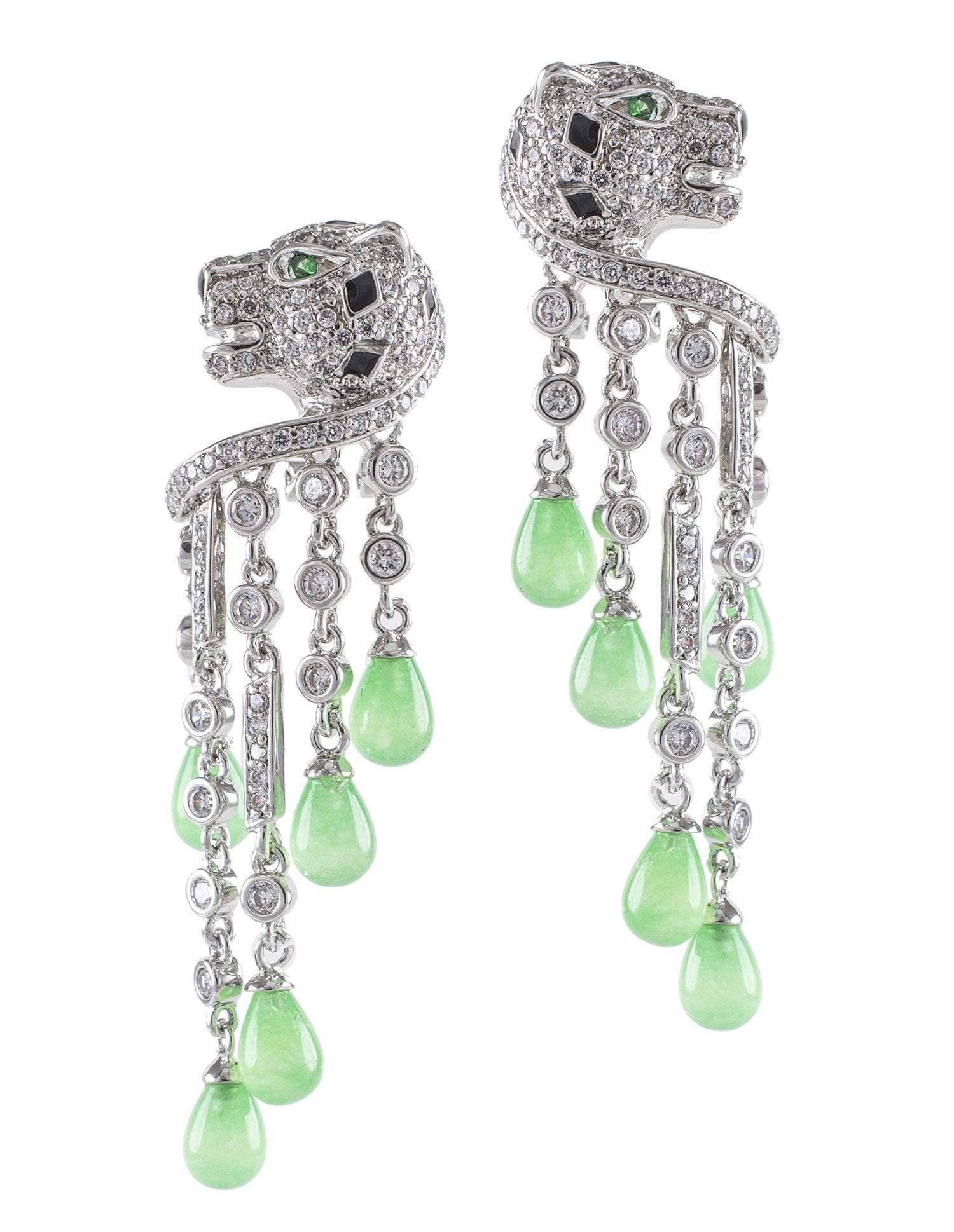 The panther is an iconic 1920'a symbol of power and elegance, these exotic earrings feature hand cut and hand set diamond simulants with cascading fringe detail.