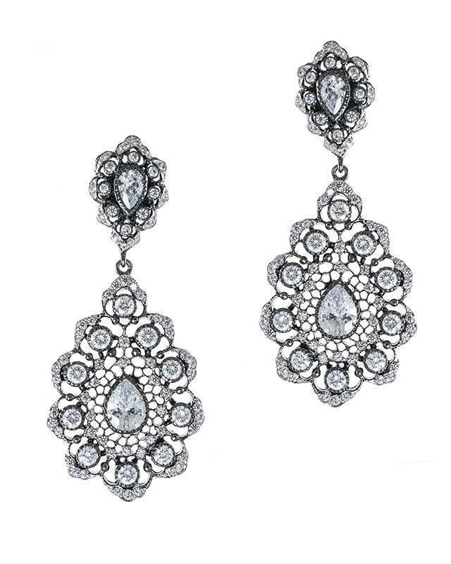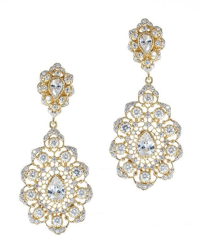 7 CTTW Pave Cubic Zirconia pear shape filigree drop earrings. Pierced Ear. Set in precious metal brass.