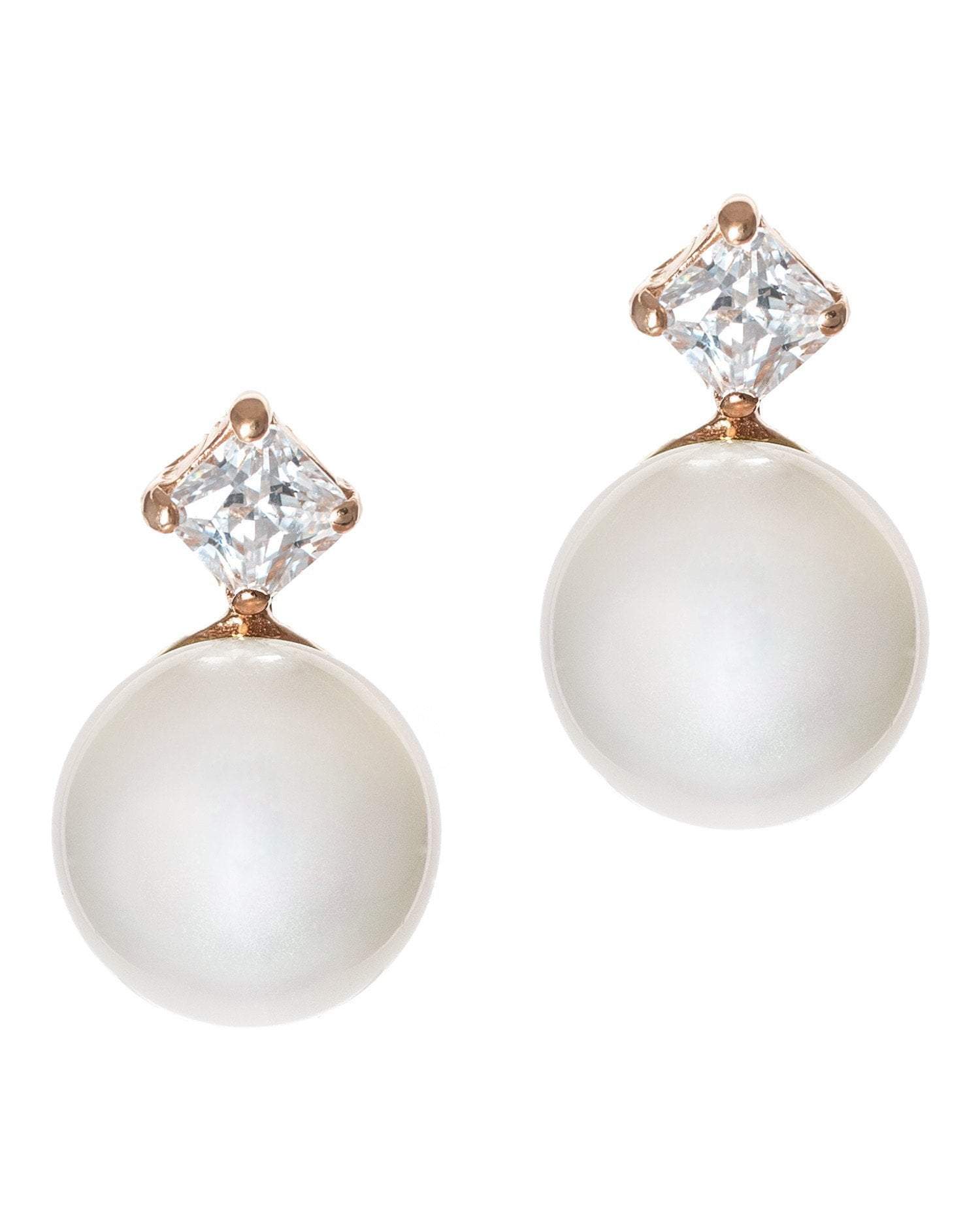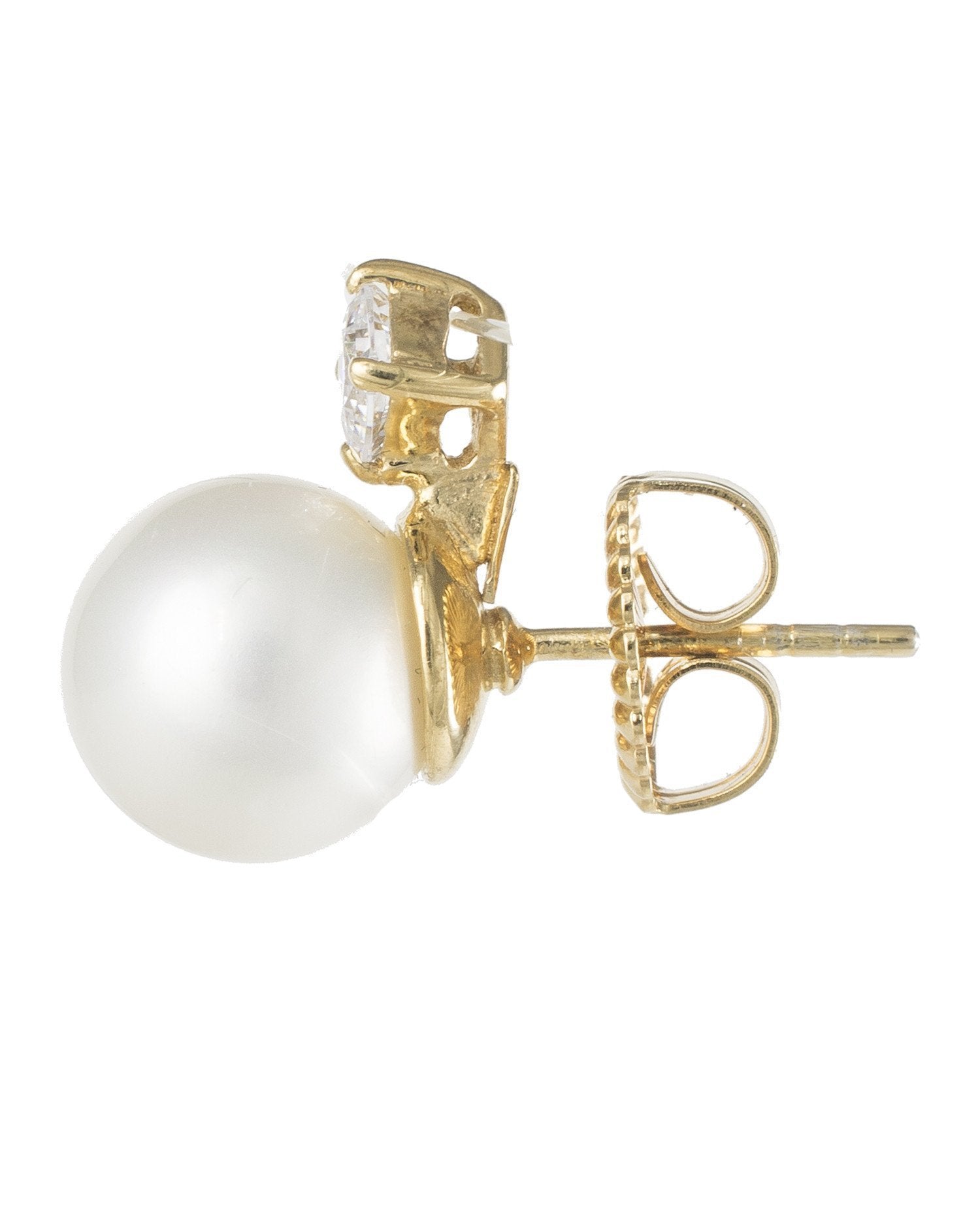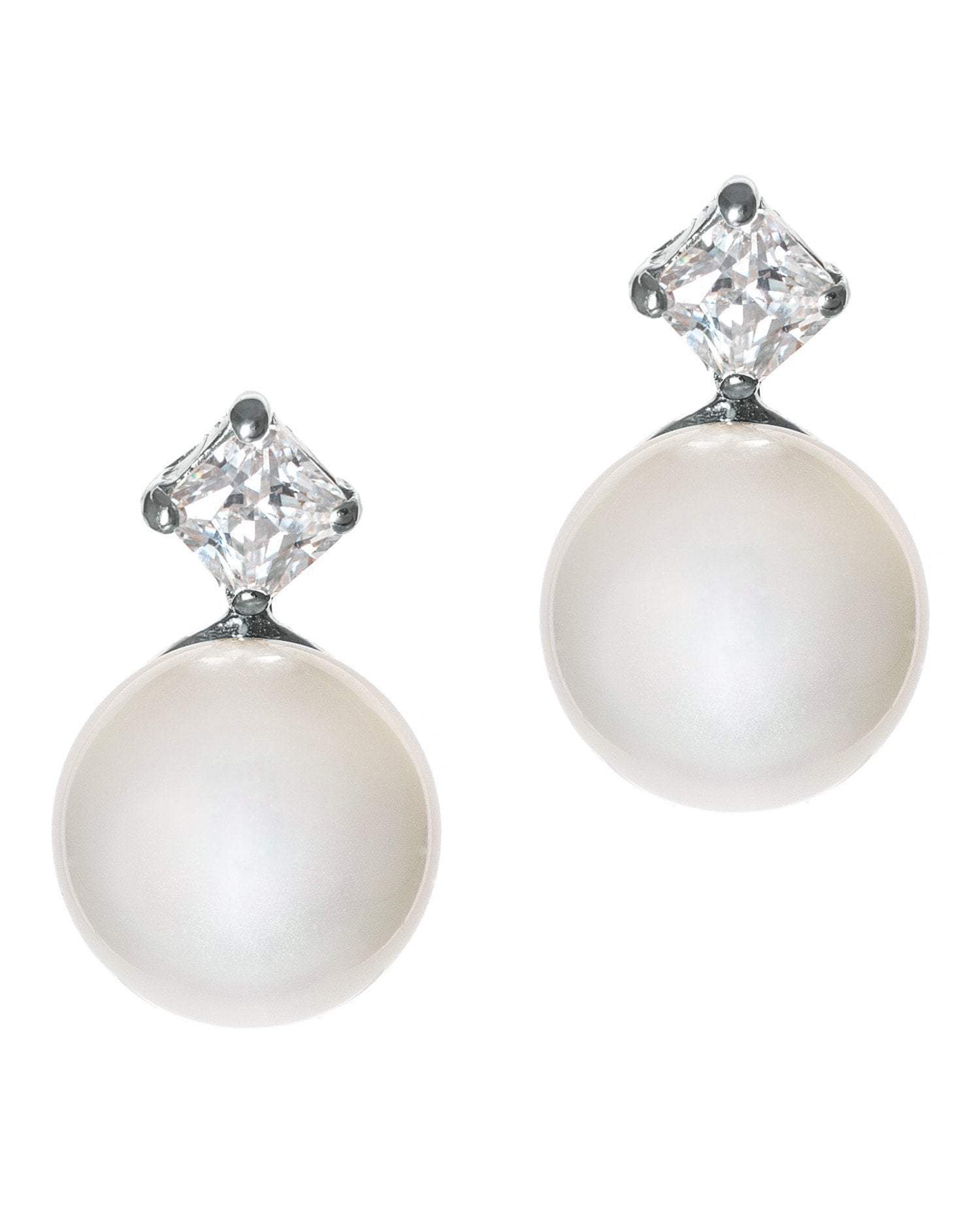 Traditional and classic Sterling Silver pierced earring featuring a 10mm shell pearl topped off with a shimmering diamond simulant.