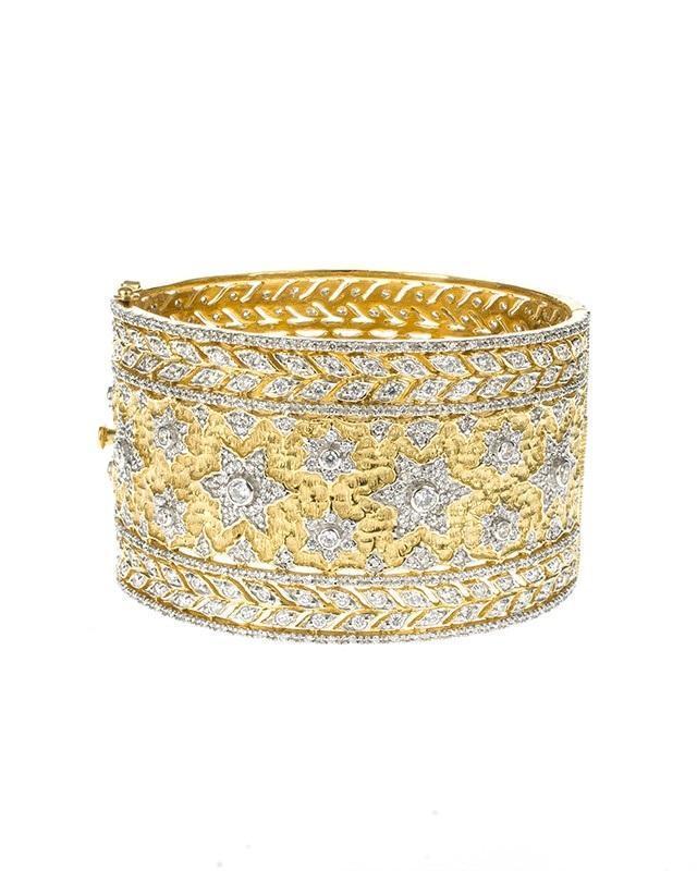 5 CTTW Pave Cubic Zirconia star design hing cuff with leaf detail trim. Set in 18k gold plated brass.