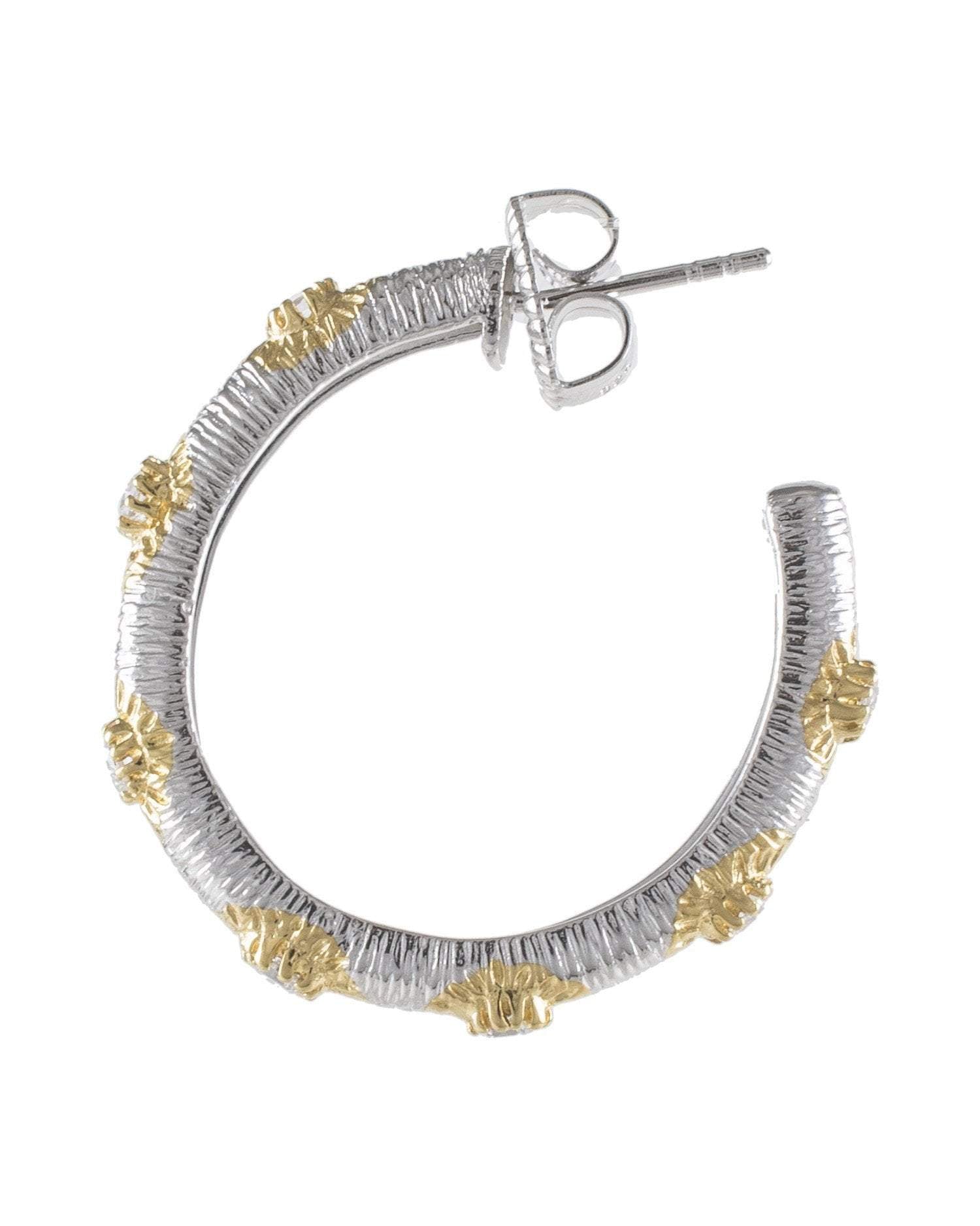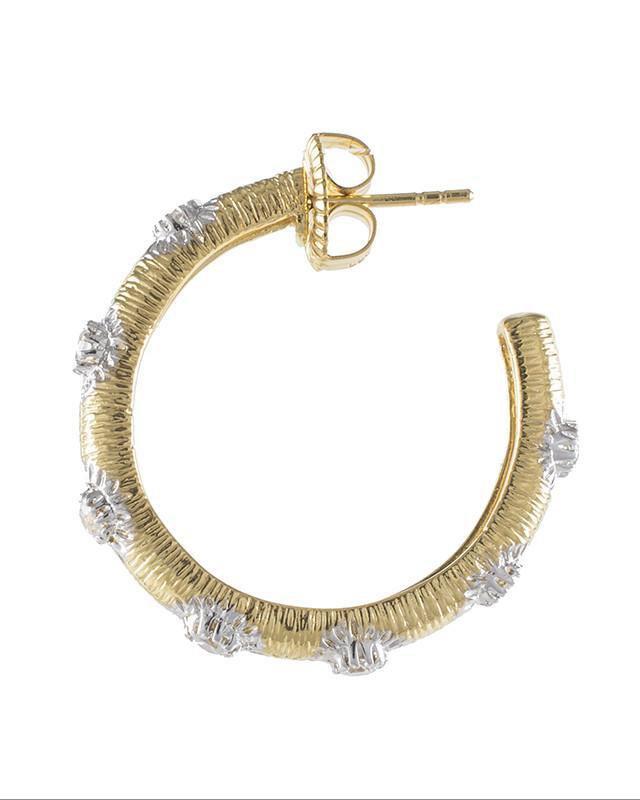 Small Sterling Silver pierced hoop earring in the traditional scratched "mortelato" finish. This design features a star pattern hand set with diamond simulants.