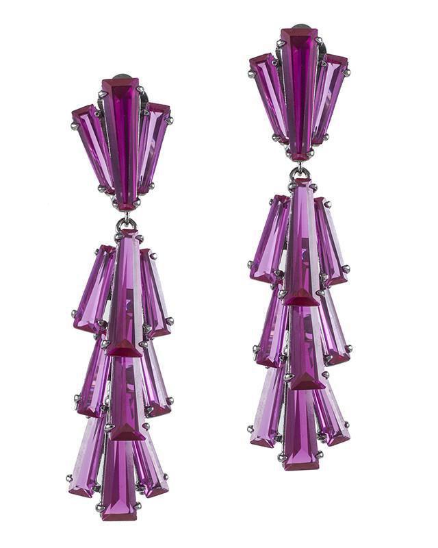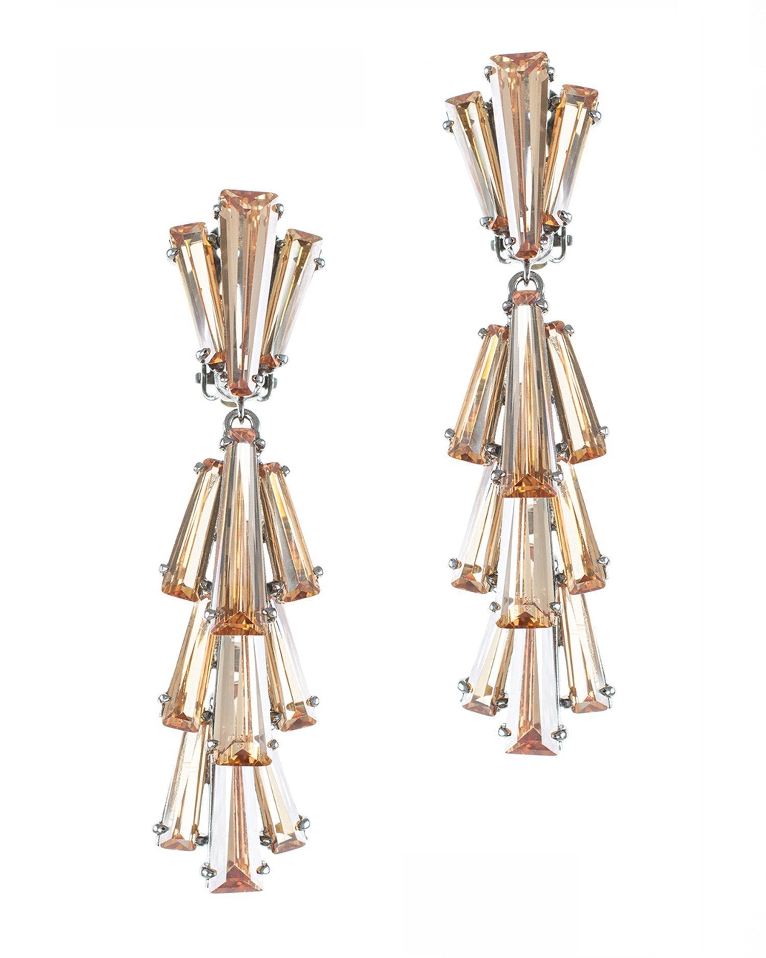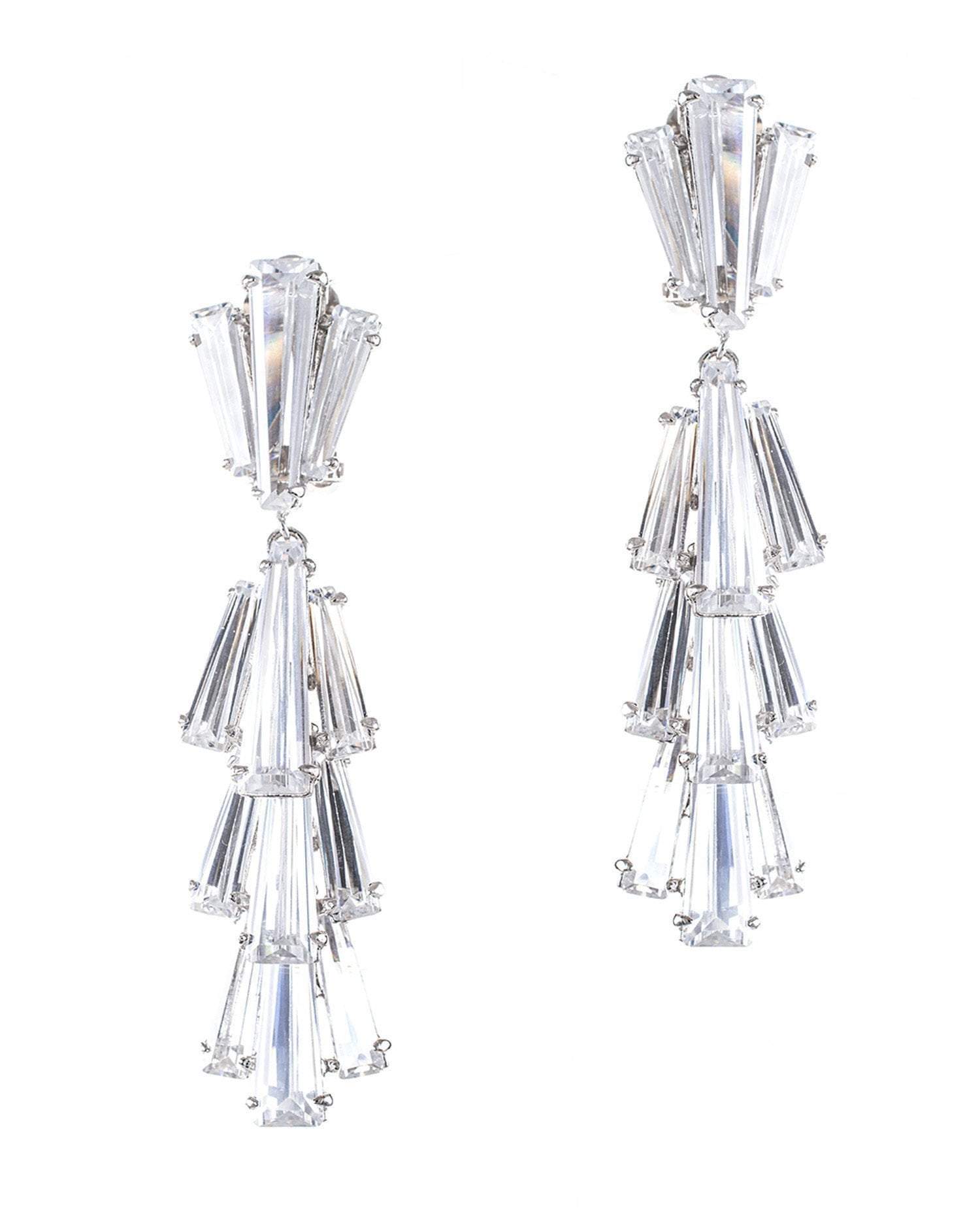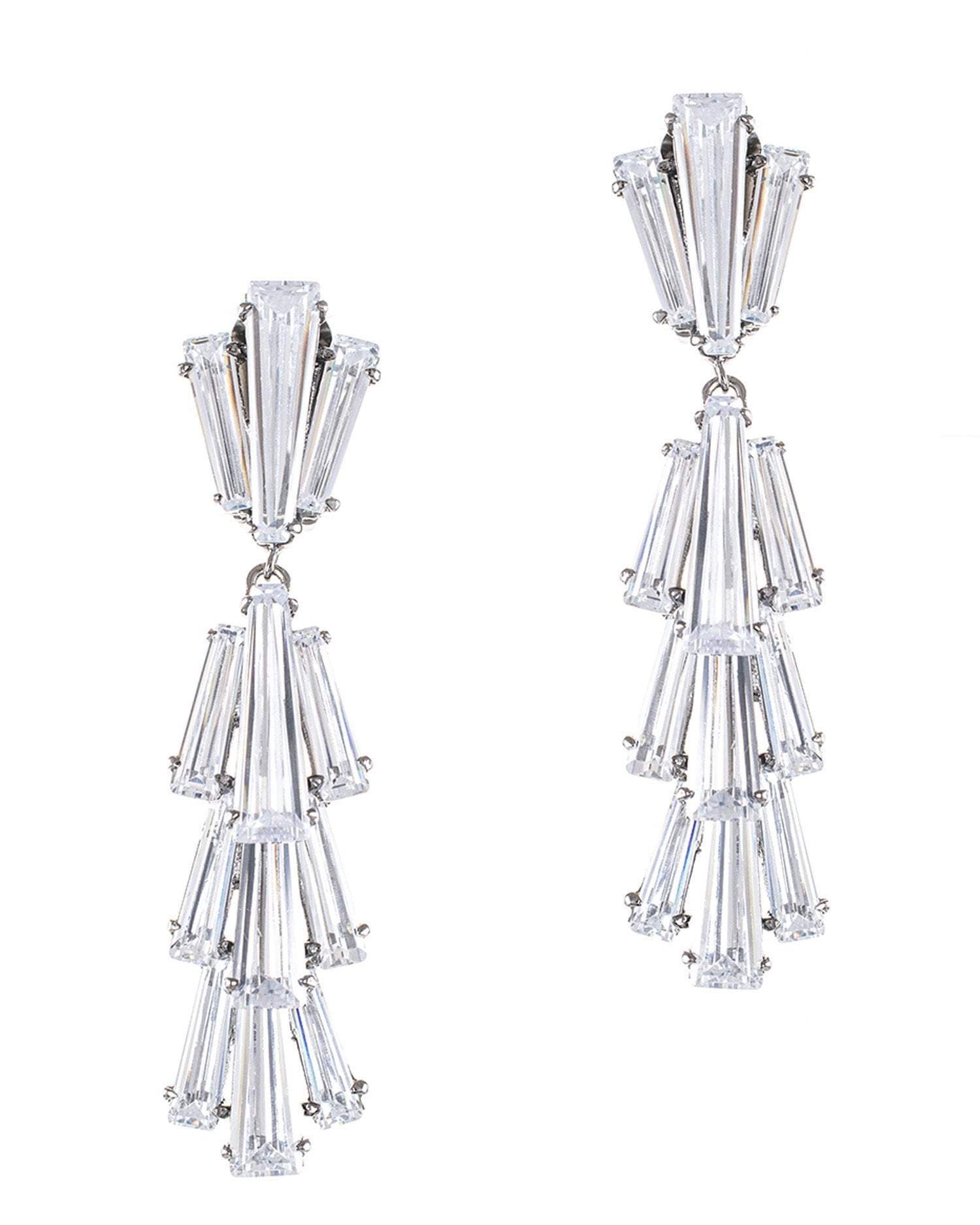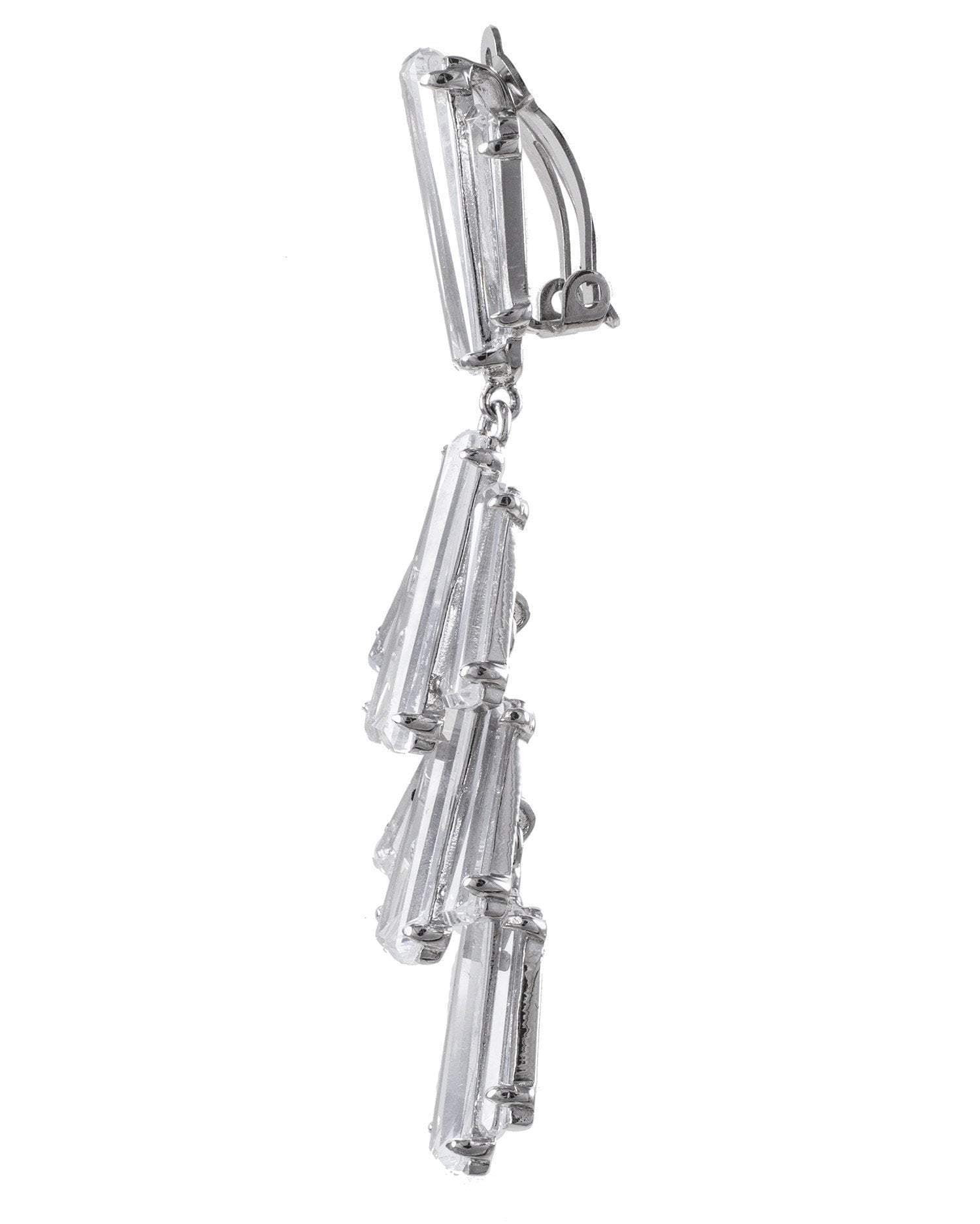 Created using our custom cut cubic zirconia tapered baguettes, this clip earring in a dramatic waterfall design is the perfect compliment to any cocktail dress or gown.