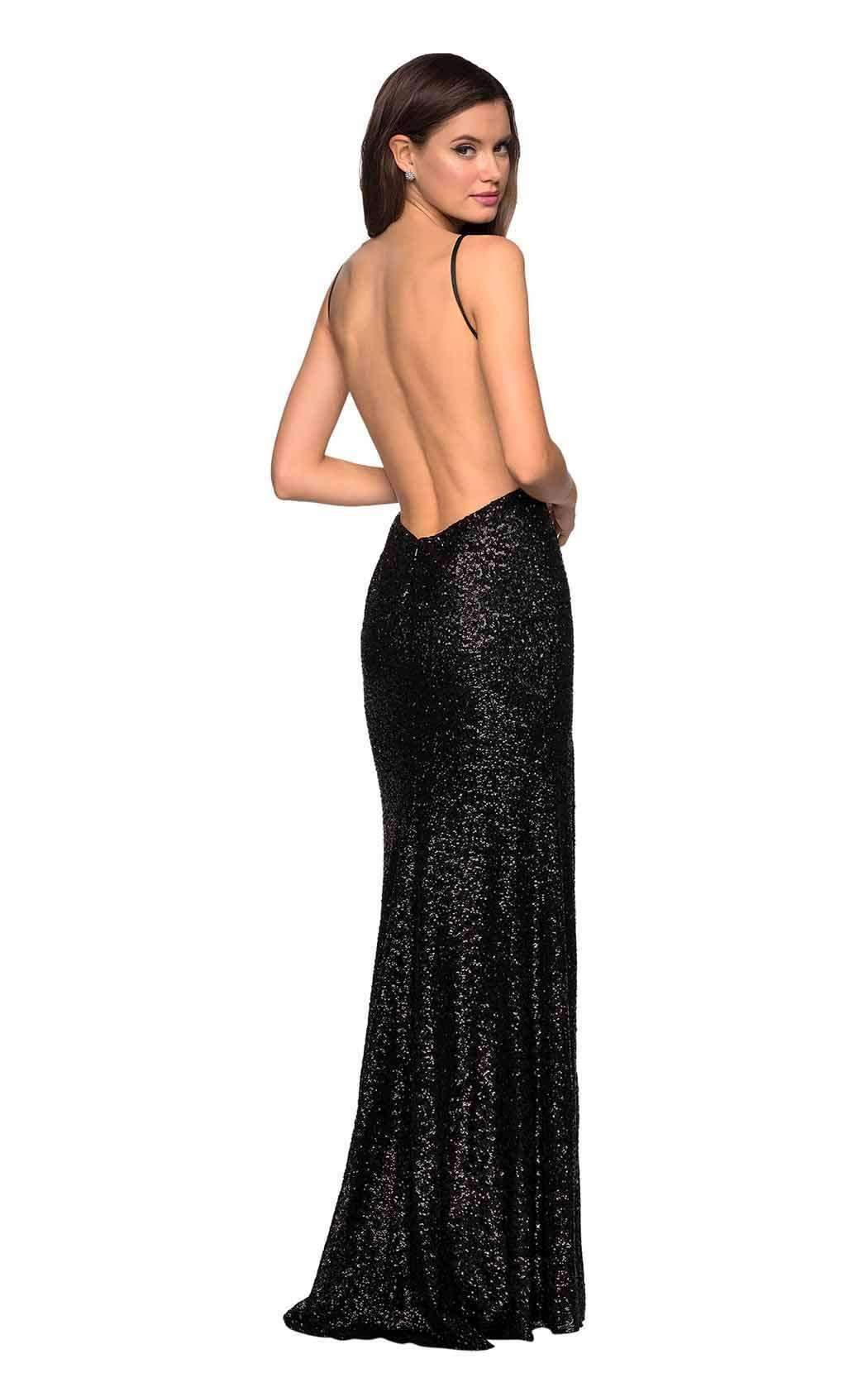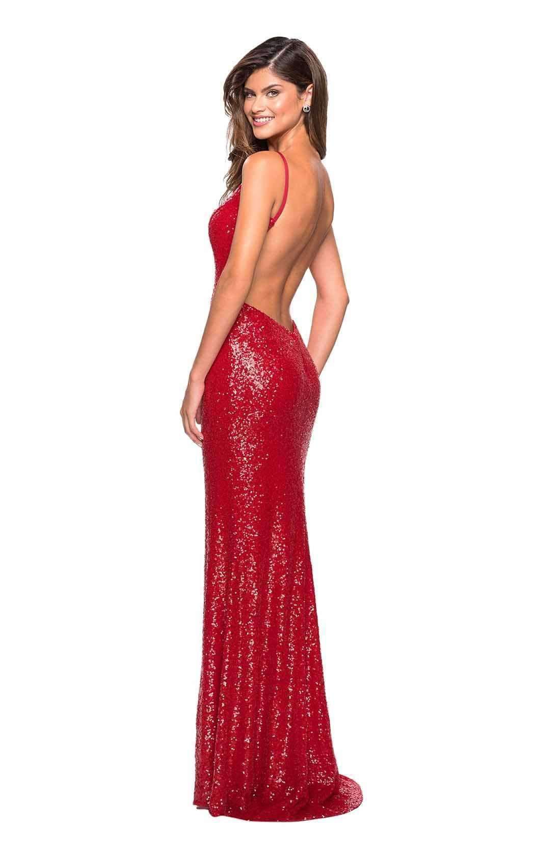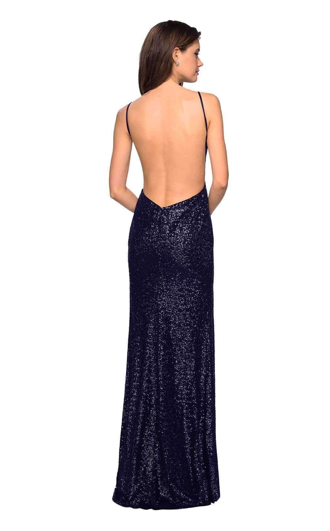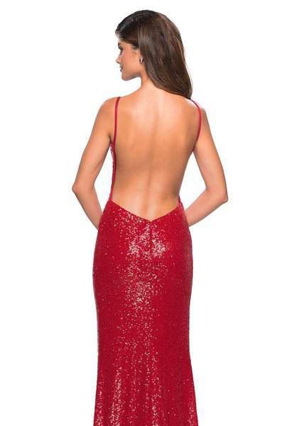 Get to be a definitive stunner when you walk with flair in this La Femme 27585 creation. Exquisitely ornamented with sequins all over the entire silhouette, this glistening piece showcases a straight-across neckline supported with spaghetti straps. Defined with a v-notched backless design, the sheath skirt parts with a high slit as it falls iridescently into a full-length hemline and a subtle train. Stand out with luminous sophistication brought by this La Femme masterpiece. Models are wearing the Black, Red and Navy colors.