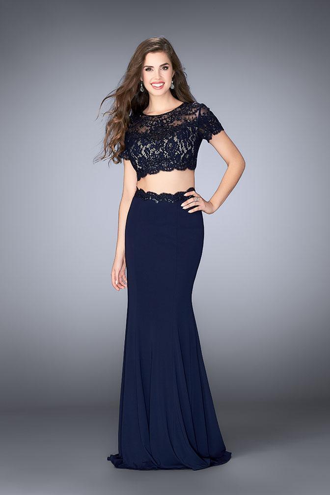 Heighten your charming appeal in this luxurious La Femme Gigi Dress 23912 by La Femme. An attractive beaded lace two piece jersey gown. The top, sleeves and belt have scalloped lace edges. Back zipper closure. La Femme Gigi is your best choice for prom or for any special occasion and achieve that exceptional regal look!