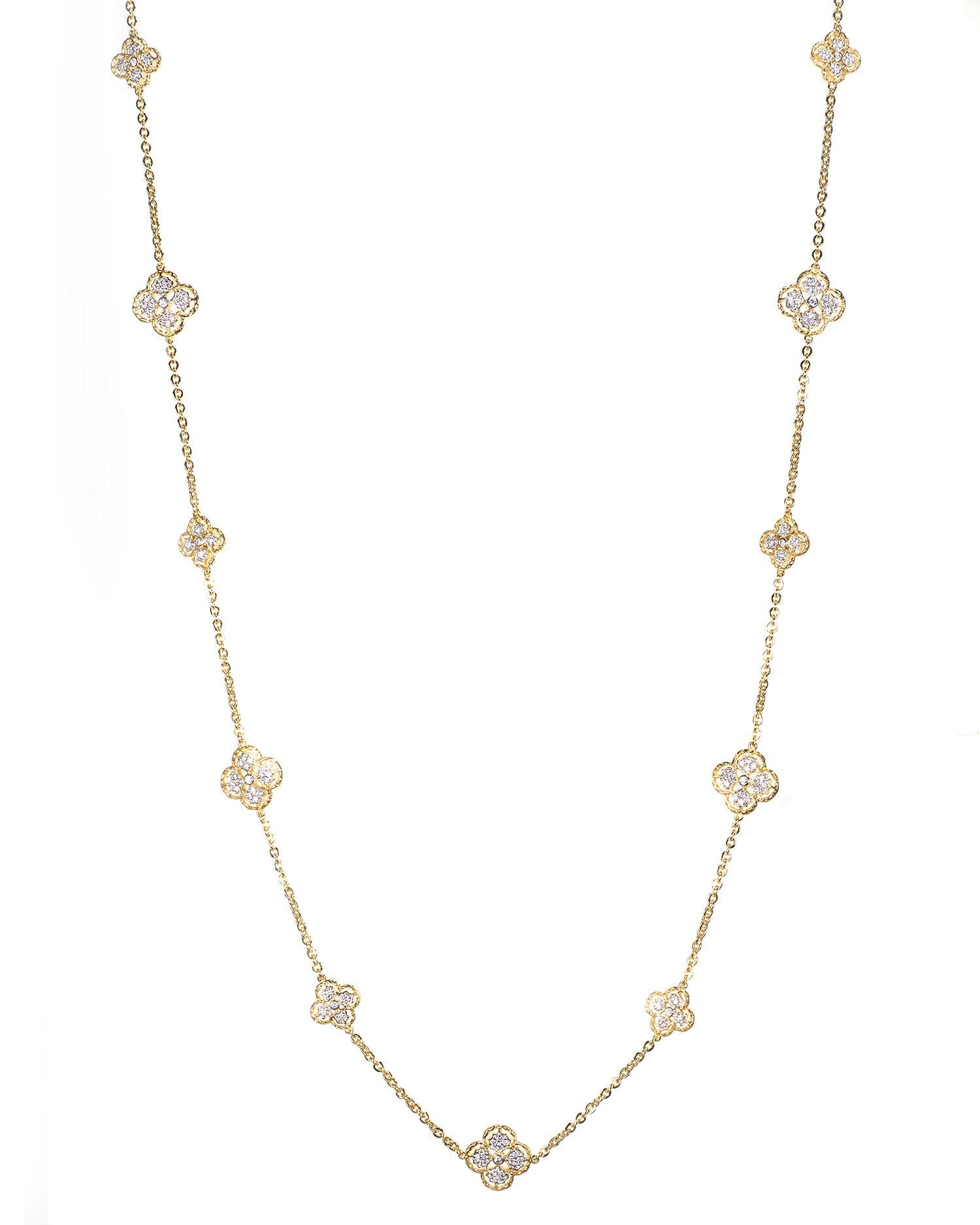 Two sizes, in an alternating pattern of the Romantic Lace Clovers make for an easy to wear layering necklace. The center of each clover leaf is hand set using the finest diamond simulants