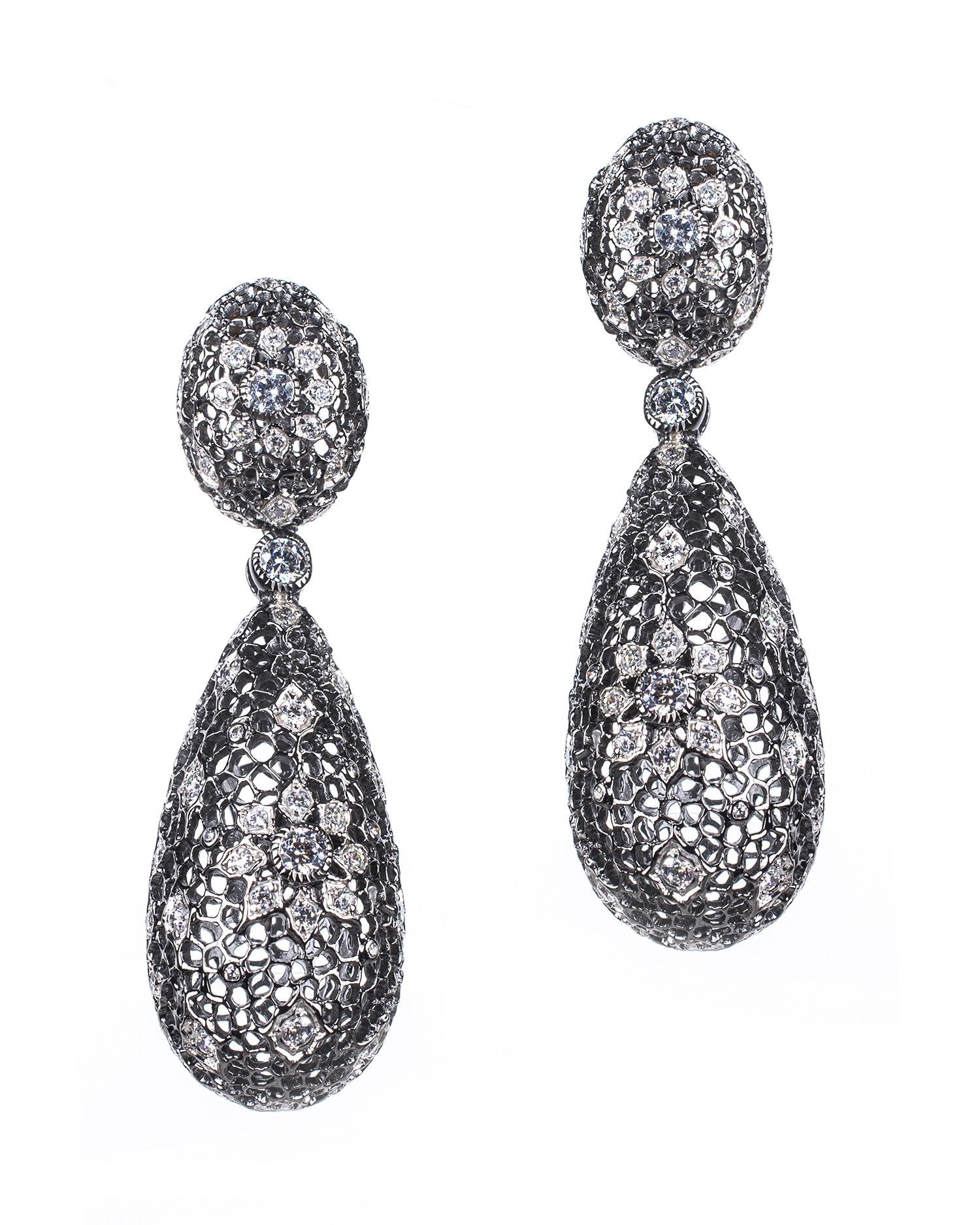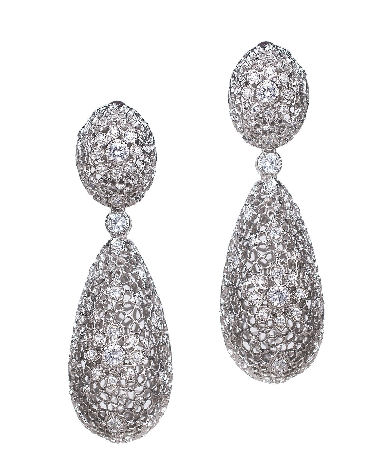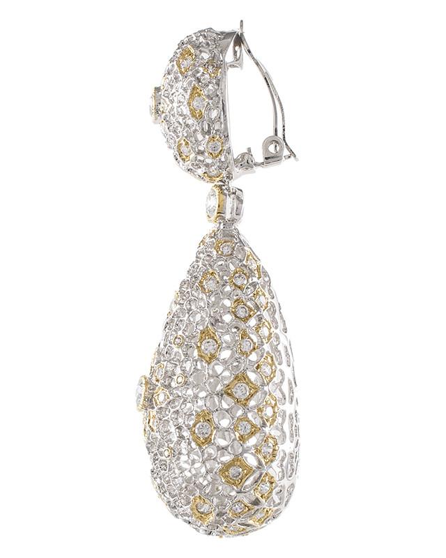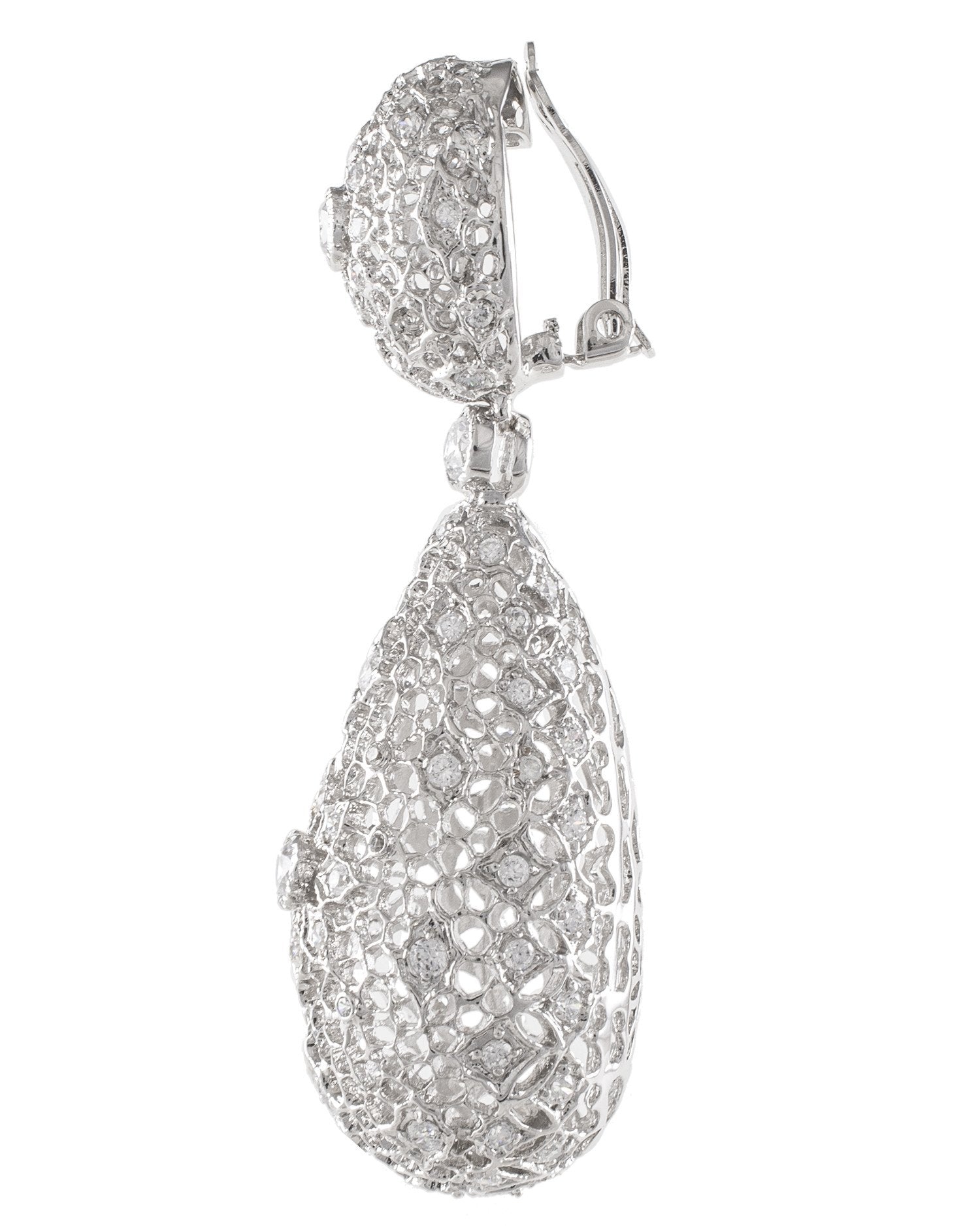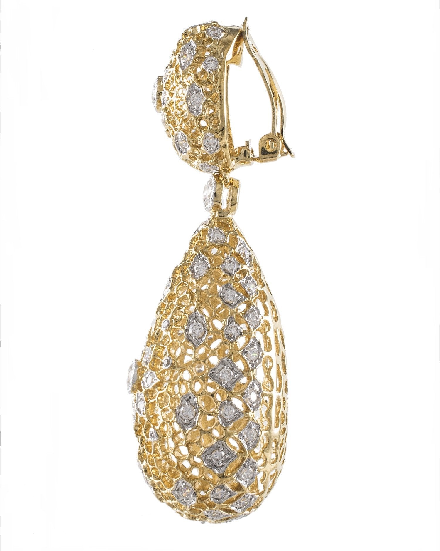 Large clip earring in the classic Floral Lace design. Oval button on the ear with a beehive drop. The flower petals are set with hand cut cubic zirconia.