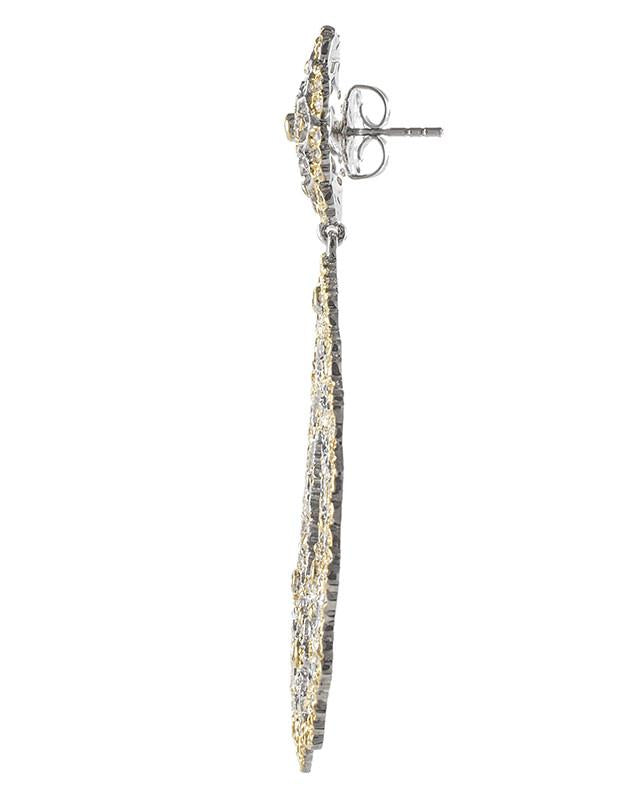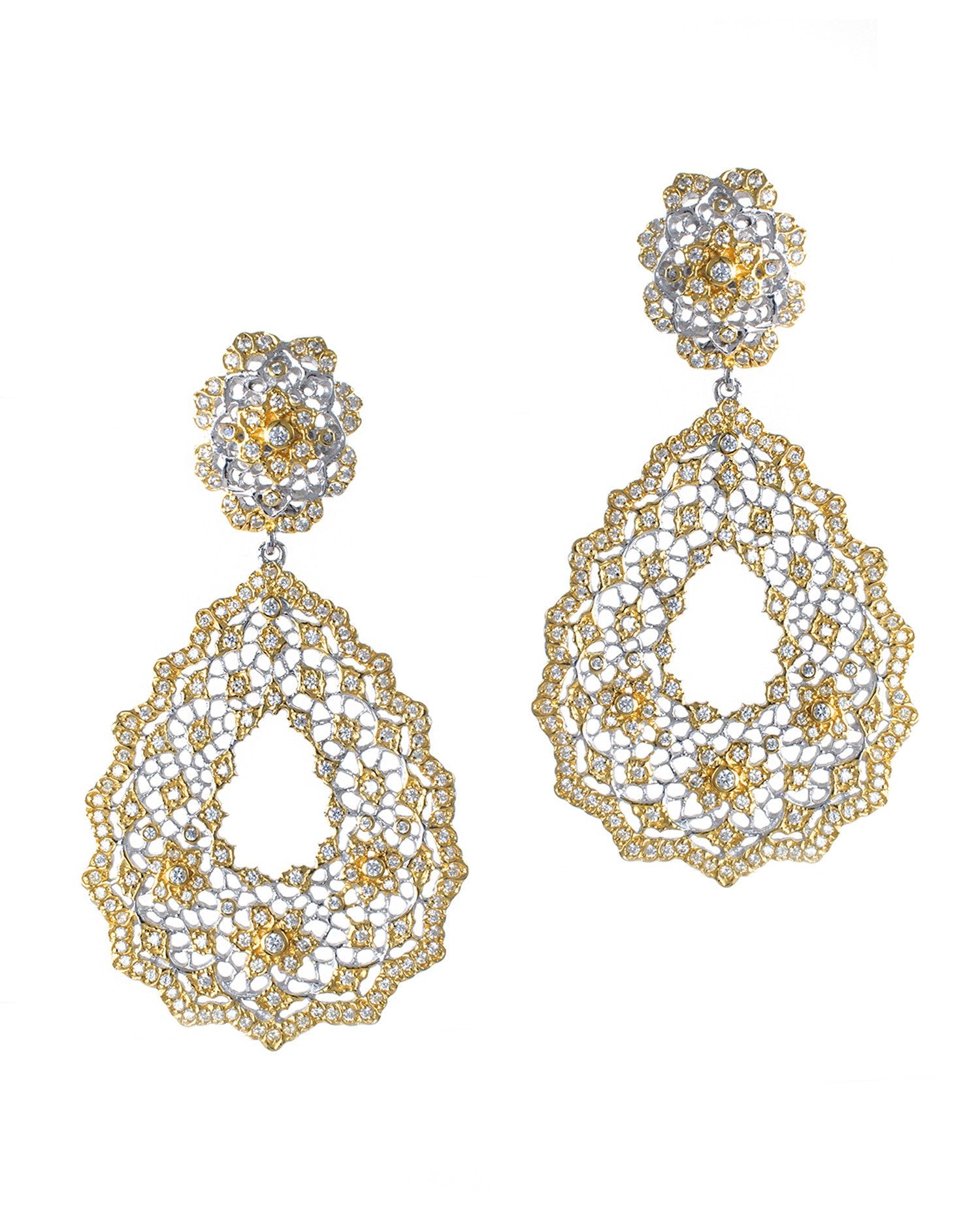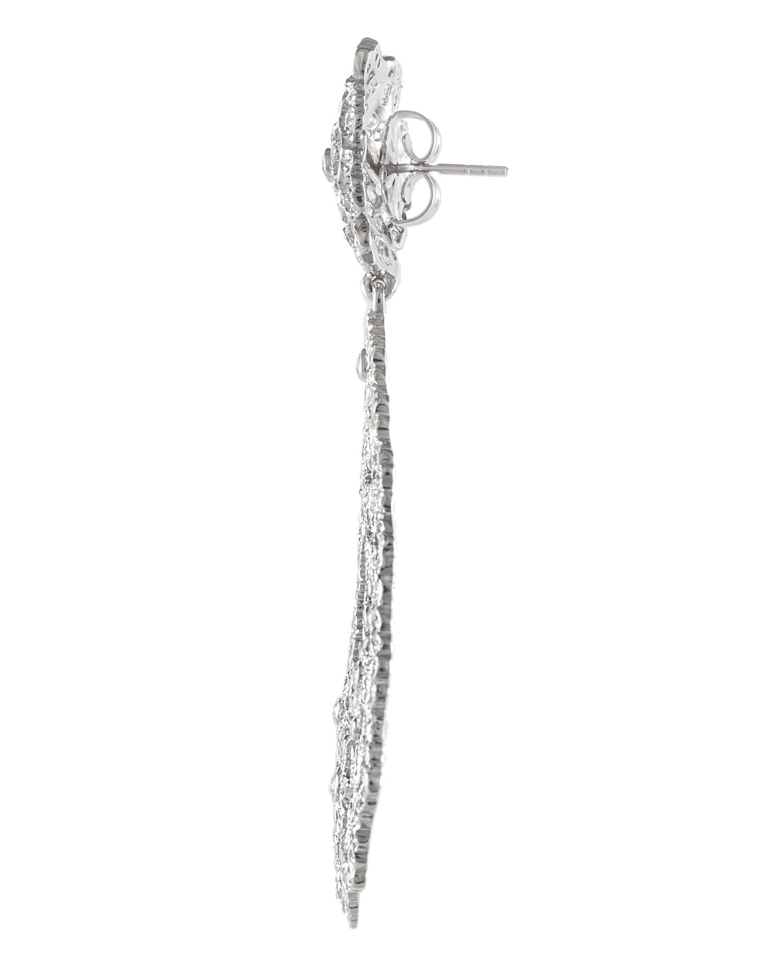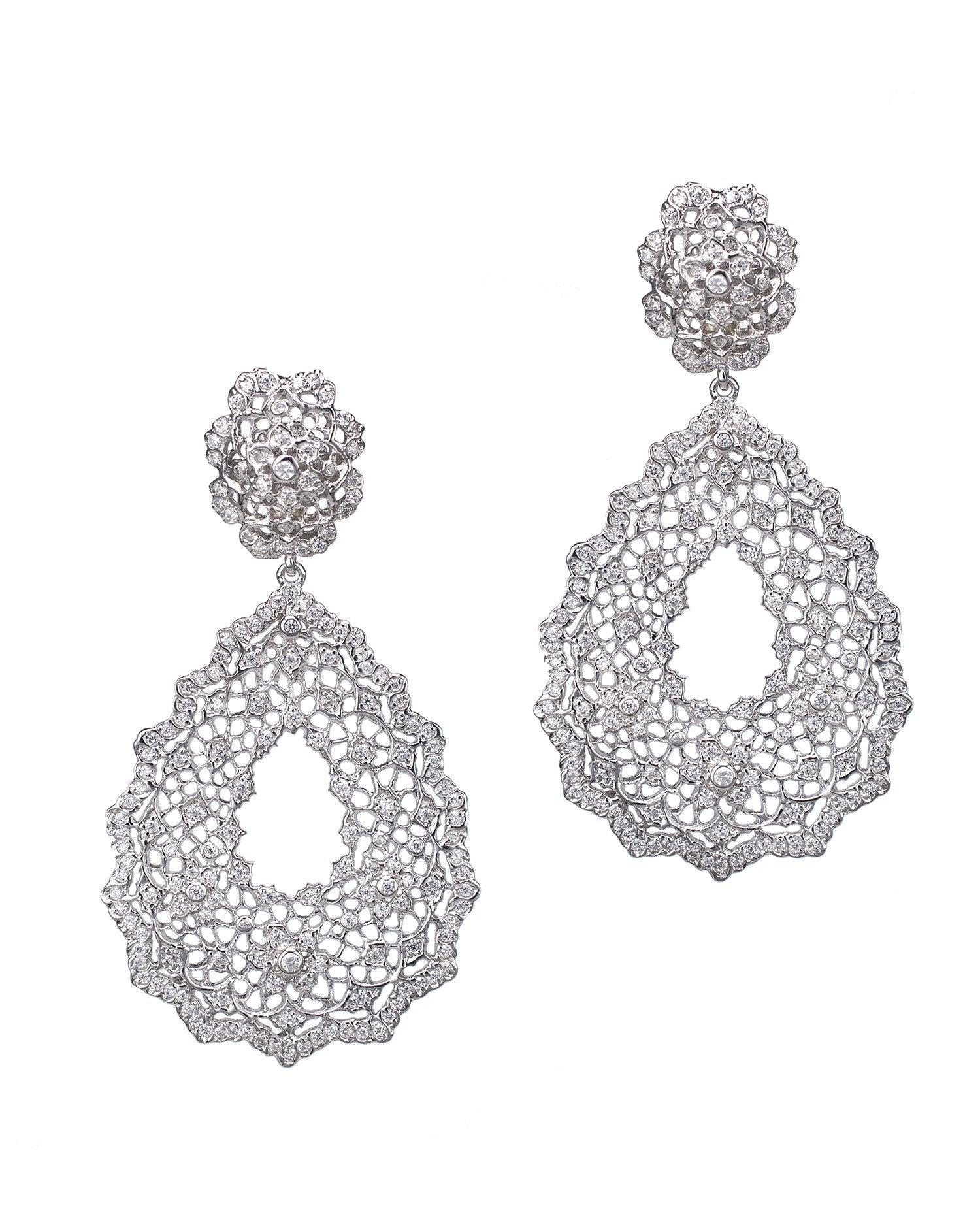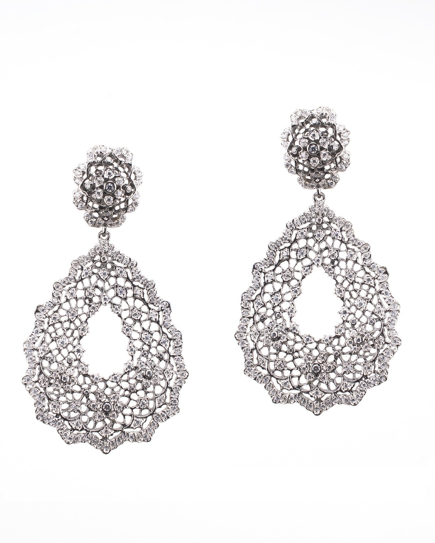 Large pierced earring in the classic Floral Lace design. Scalloped oval on the ear with an open pear centered drop. The flower petals are set with hand cut diamond simulants.